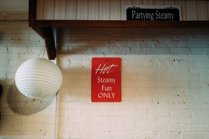 This photograph captures a playful sign against a rustic white brick wall, infusing a sense of humor and mischief into the space. Soft, warm lighting highlights the vibrant red of the sign, contrasting with the muted tones of the surroundings, enhancing the casual, inviting atmosphere. The composition is balanced, with the hanging lantern and other signs framing the focal point, adding layers of interest to the scene.