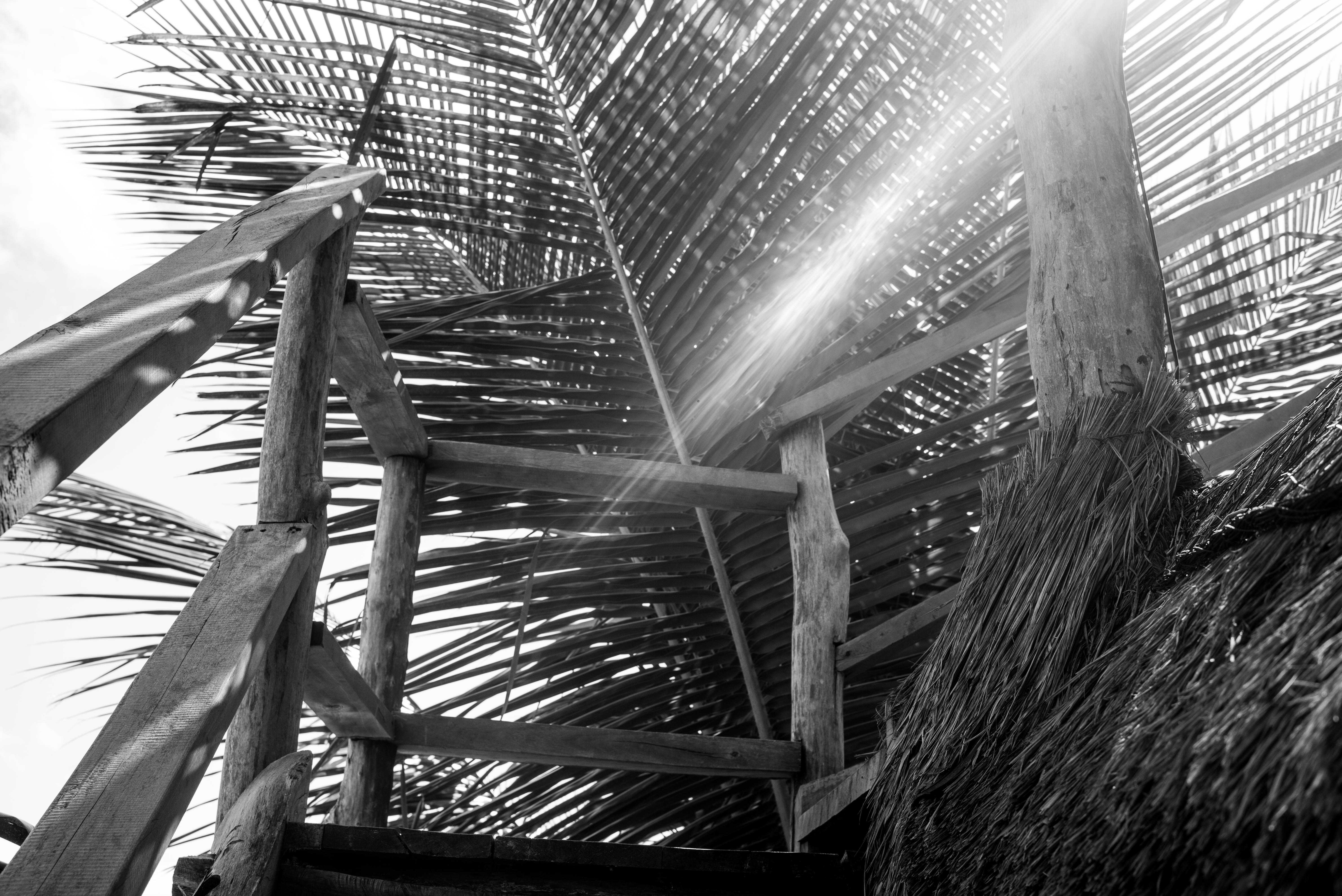 A monochrome photograph captures a rustic wooden staircase leading upwards, enveloped by the dramatic lines of palm fronds overhead. The interplay of light and shadow creates a serene yet mysterious mood, hinting at a journey between earth and sky. The composition draws the eye upward, inviting viewers to explore the hidden world that lies above.