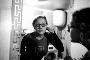 In a dimly lit setting, a woman peers intently into a mirror, her expression a mix of focus and contemplation. The black-and-white composition enhances the intimacy of the moment, drawing attention to her delicate features and the subtle details of her surroundings. Soft lighting casts gentle shadows, creating a reflective mood that invites viewers to ponder her thoughts and emotions.