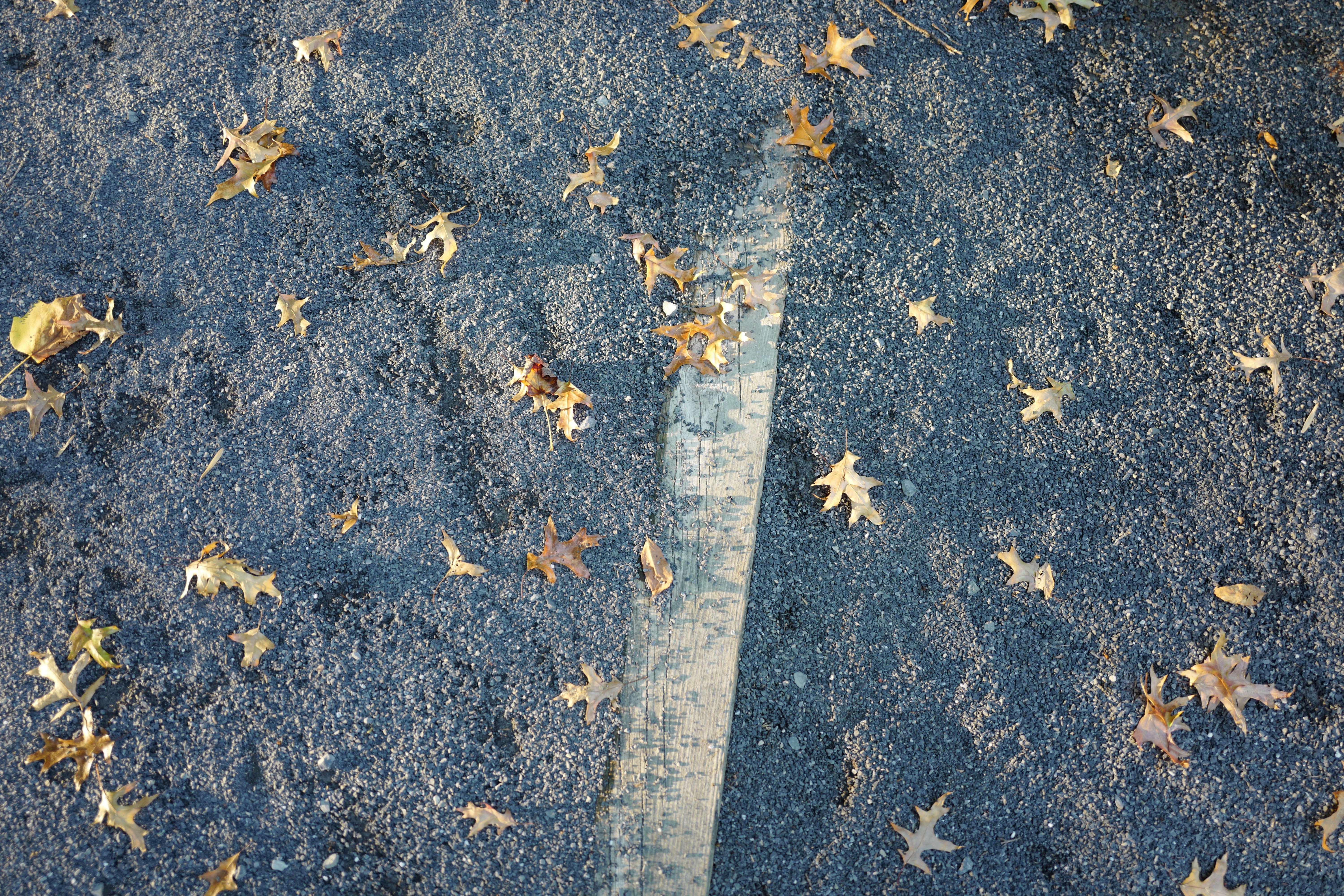 In this overhead shot, scattered leaves blanket a textured surface, their golden hues contrasting with the dark ground. A ruler subtly emerges, hinting at measurement against the backdrop of nature's decay. The soft, warm lighting evokes a tranquil, reflective mood, inviting viewers to contemplate the passage of time.