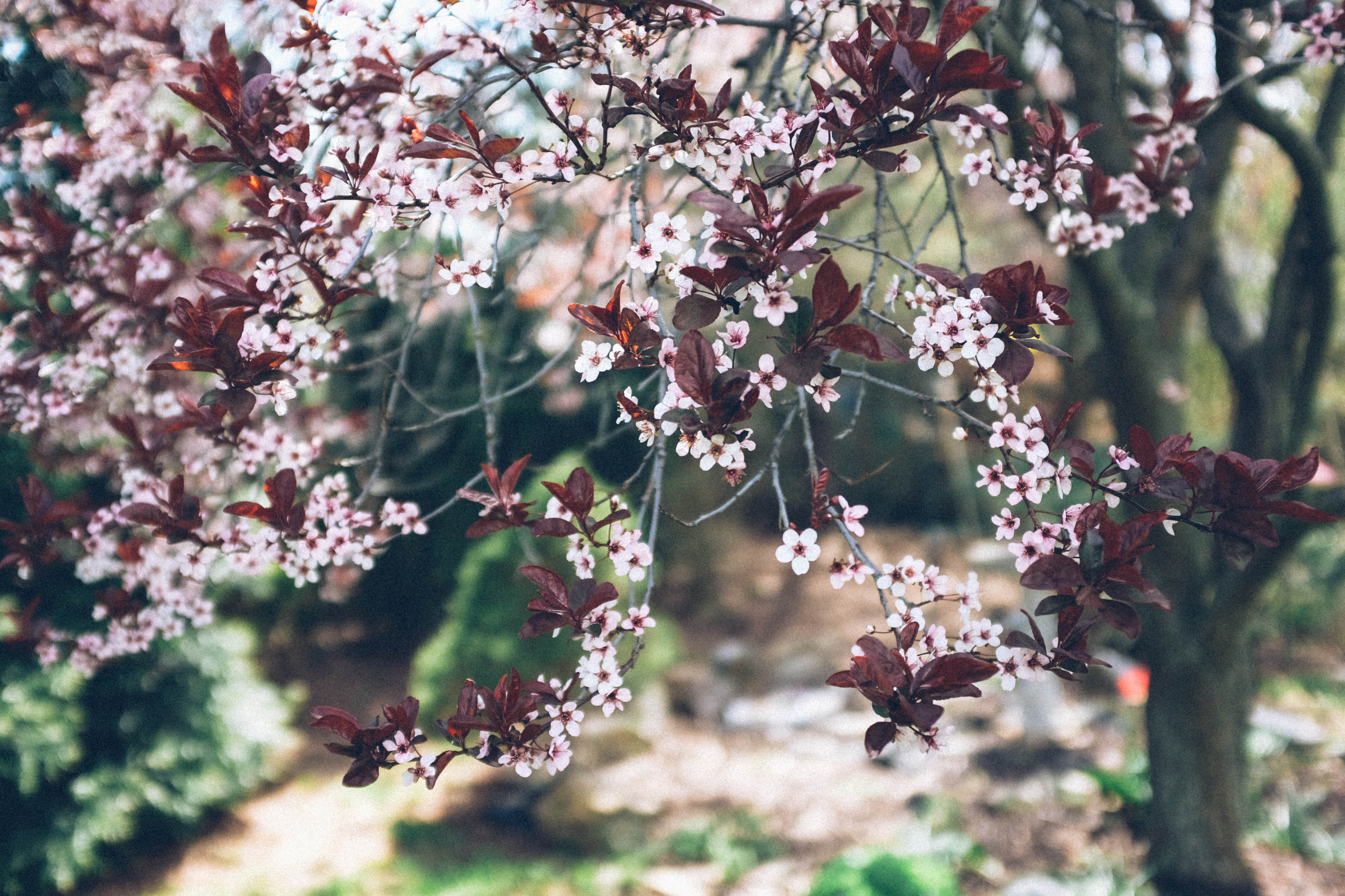Delicate pink blossoms dangle from deep burgundy leaves, creating a soft contrast that captures the essence of spring. The blurred background hints at a lush garden, enhancing the intimate feel of the photograph. Soft, natural light bathes the scene, evoking a serene and tranquil mood.