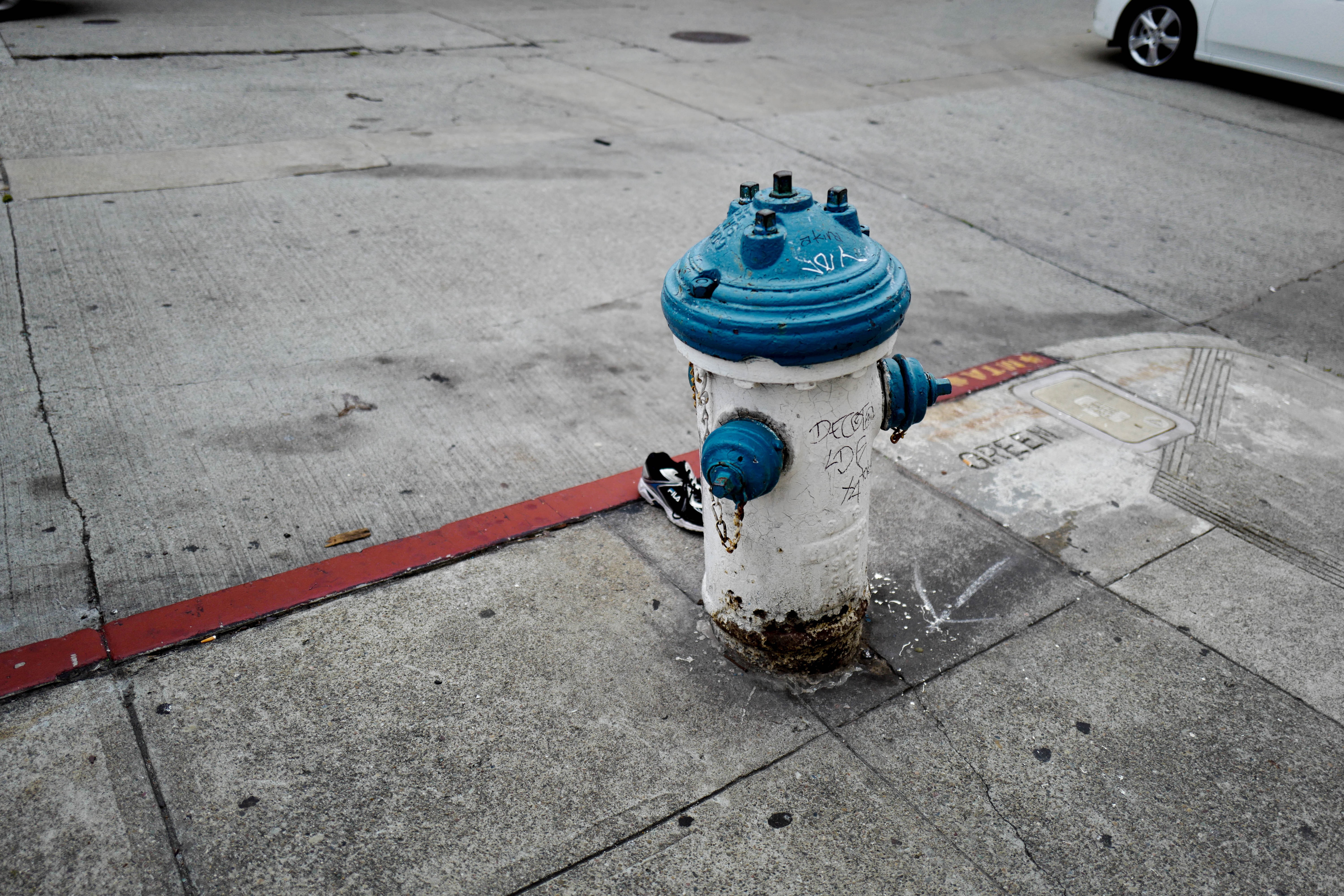 In this photograph, a solitary fire hydrant commands attention amidst the muted urban landscape, its vibrant blue contrasting against the worn concrete and faded markings on the pavement. The lighting is soft, casting gentle shadows that enhance the feeling of loneliness and neglect. A hint of mystery is evoked by the tucked-away sneaker, hinting at untold stories of the bustling street.