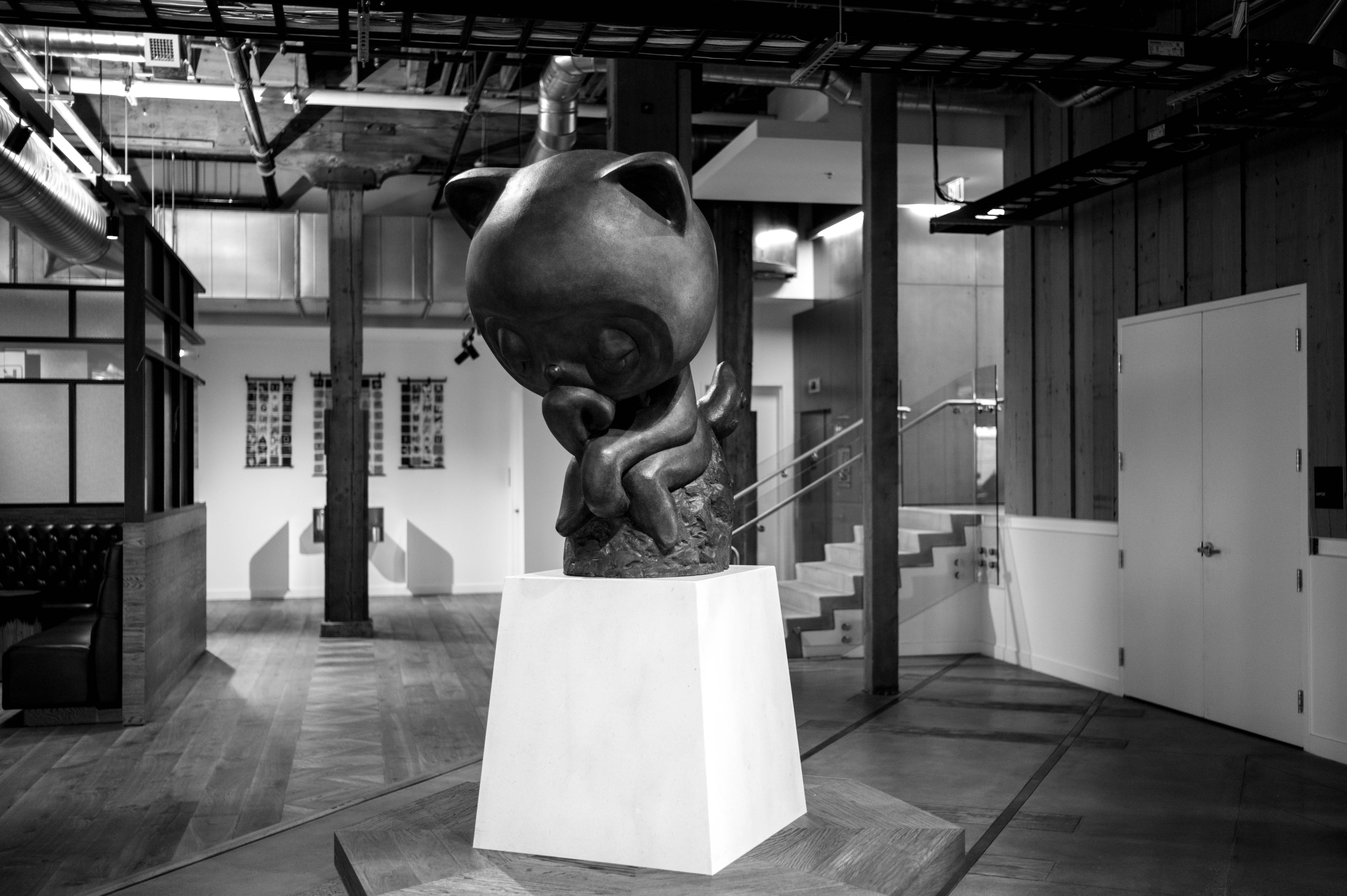 A large, bronze sculpture of a child-like figure sits thoughtfully on a stark white pedestal, creating a striking contrast in the industrial-style environment. The soft lighting enhances the mood of introspection, while the monochrome palette adds an air of elegance and nostalgia. Surrounding details, like wooden textures and metallic accents, complement the artwork, drawing the viewer's attention to its delicate expression.