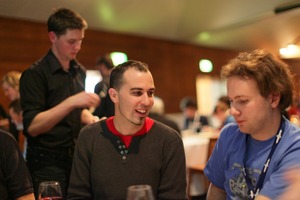 In a cozy restaurant setting, two men engage in a lively conversation, their expressions showcasing joy and camaraderie. Soft lighting enhances the warm atmosphere, while blurred figures in the background hint at a bustling gathering. The composition draws the viewer's focus toward the animated facial expressions of the subjects, creating an inviting and intimate mood.