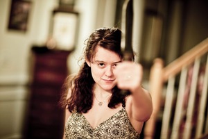 A young woman stares directly at the camera with a fierce determination, holding a long object as if ready to defend herself. The soft ambient lighting casts a warm glow, contrasting with the intensity of her expression. The blurred background adds depth to the scene, emphasizing her bold presence amidst the confines of a home setting.