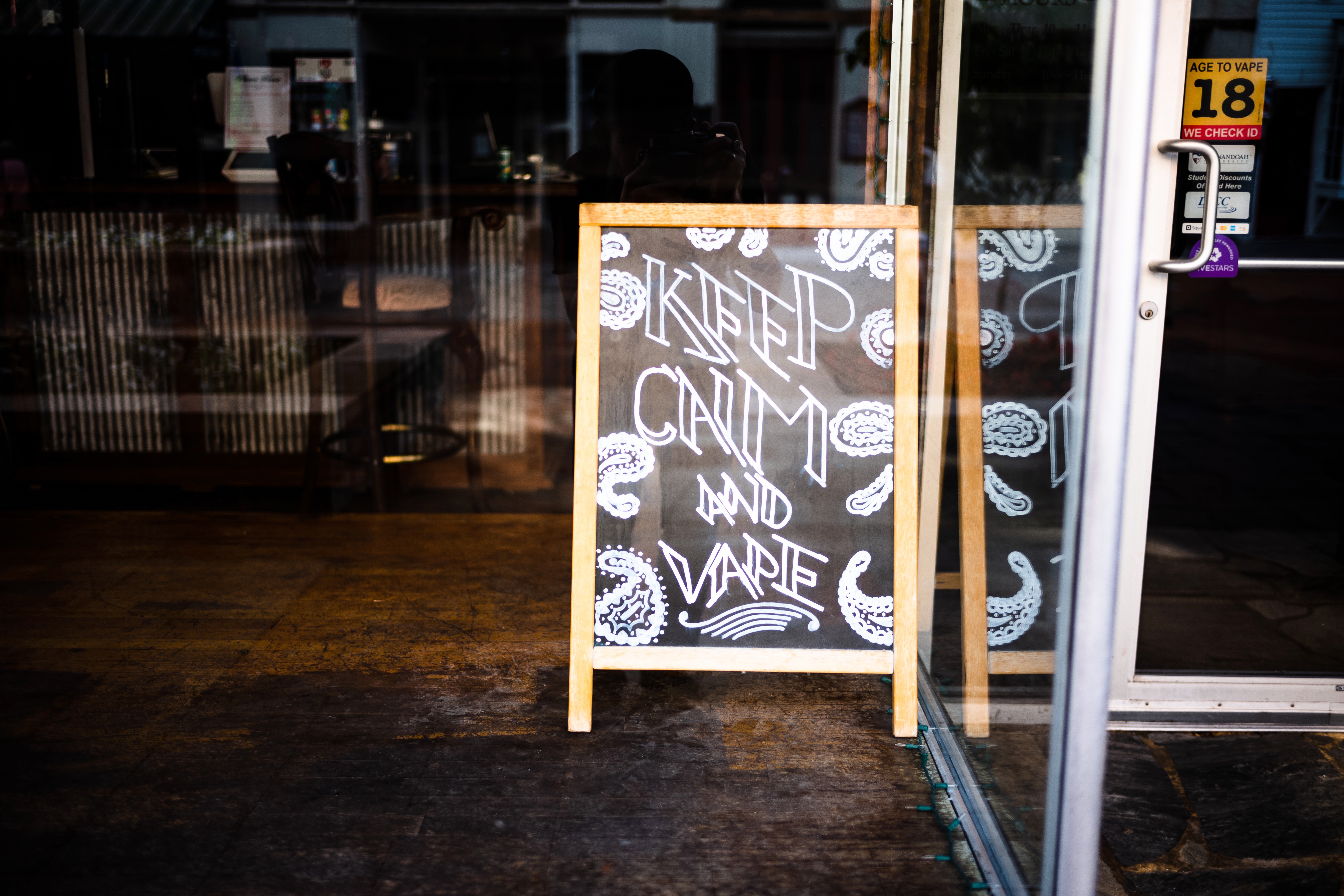 The photograph features a chalkboard sign positioned at the entrance of a vape shop, boldly declaring, "KEEP CALM AND VAPE". The warm lighting and reflective glass create an inviting atmosphere, while the cozy interior hints at a relaxed social space, blending modern culture with a touch of whimsy.