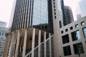 The photograph captures a striking view of a modern architectural arrangement, highlighting the interplay between glass and concrete. The sharp lines and angular forms create a sense of movement, while the soft, muted light bathes the scene in a serene yet urban atmosphere. The reflections on the glass add a layer of depth, inviting viewers to explore the complex relationship between the structures and their surroundings.