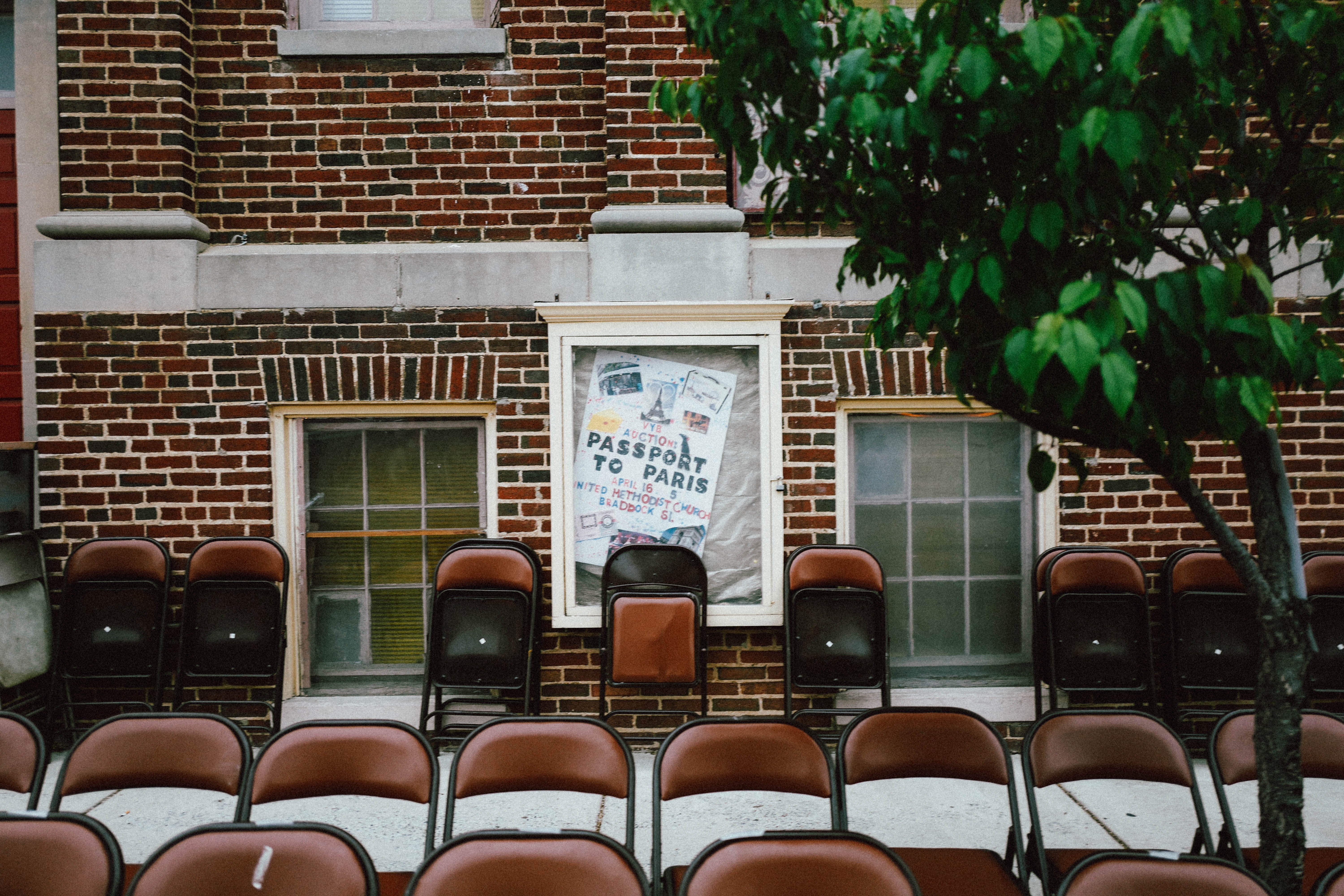 An array of empty folding chairs creates a stark yet intriguing composition that draws the eye toward a vintage poster proclaiming 'Passport to Paris.' The warm tones of the brick wall contrast with the muted greens of the nearby foliage, evoking a sense of nostalgia and yearning. Soft, natural light enhances the inviting mood, suggesting stories untold and journeys yet to embark upon.