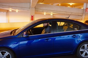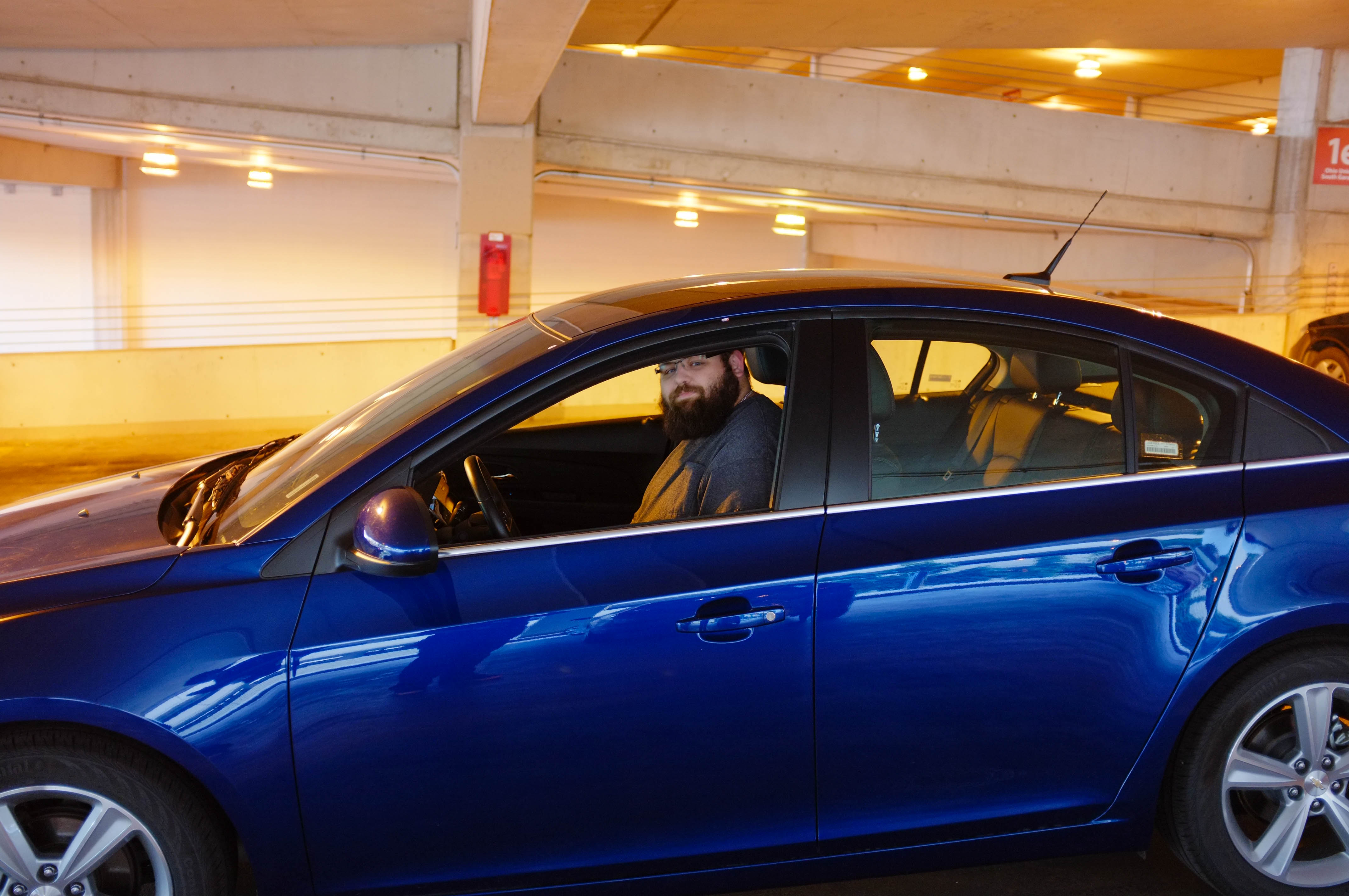 In a dimly lit parking garage, a man with a beard sits comfortably in the driver’s seat of a blue car, exuding a relaxed yet alert demeanor. The soft glow of overhead lights contrasts with the shadows, creating a mix of warmth and urban isolation. The composition frames the man and his vehicle, inviting a narrative of momentary stillness in a bustling environment.