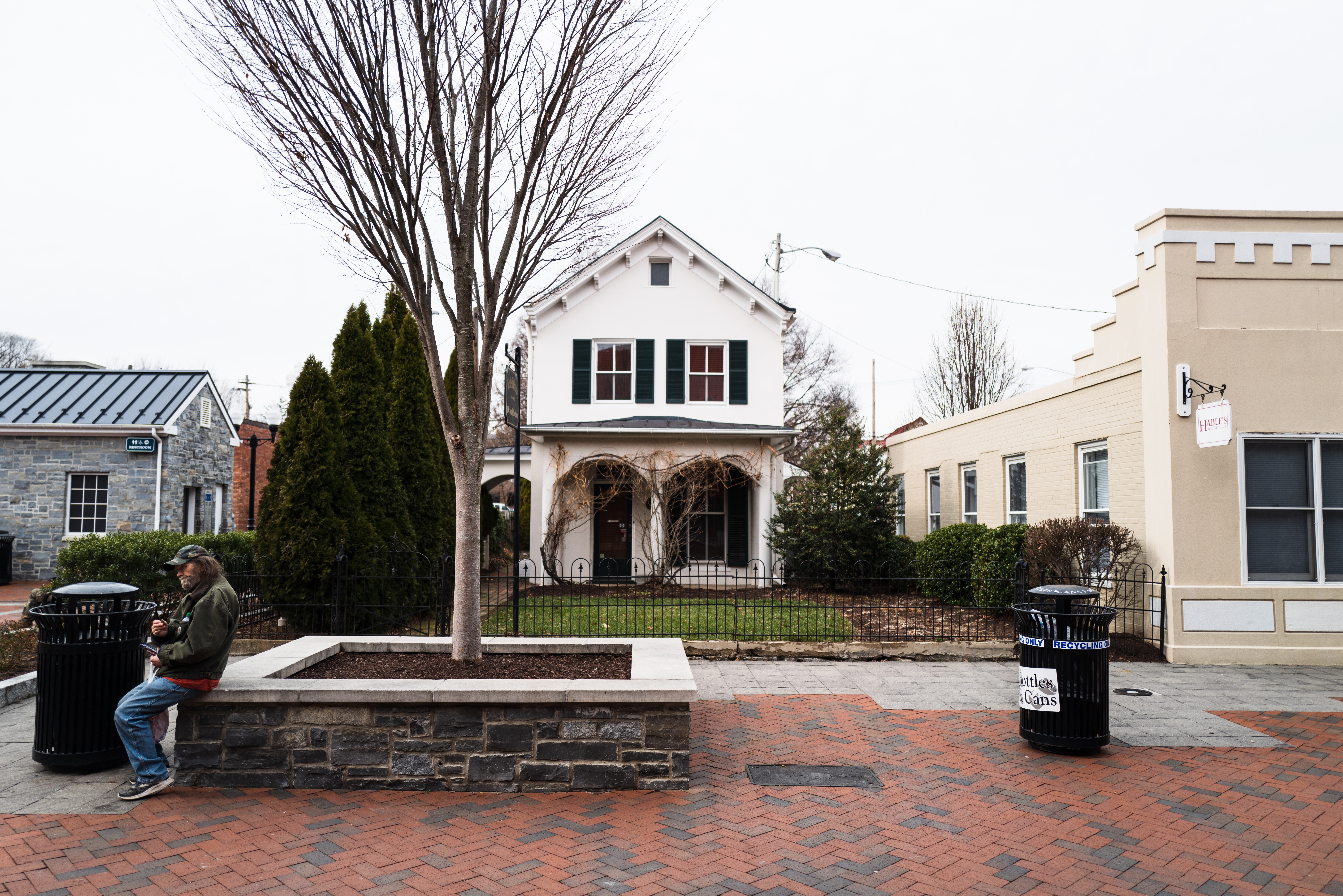 A solitary figure sits on a stone bench, immersed in a moment of contemplation against the backdrop of a quaint house with green shutters. The subdued lighting and overcast sky cast a reflective mood over the scene, while the urban elements—like the trash cans and brick pavement—contrasts with the tranquil residential space. The composition captures an intimate slice of everyday life, evoking a sense of stillness amidst the surrounding hustle.