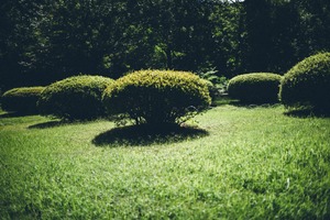 This photograph captures a tranquil garden scene, where rounded bushes punctuate the lush green grass. Dappled sunlight filters through the trees, casting soft shadows that enhance the serene mood. The composition invites the viewer to pause and appreciate the harmony of nature's shapes and colors.