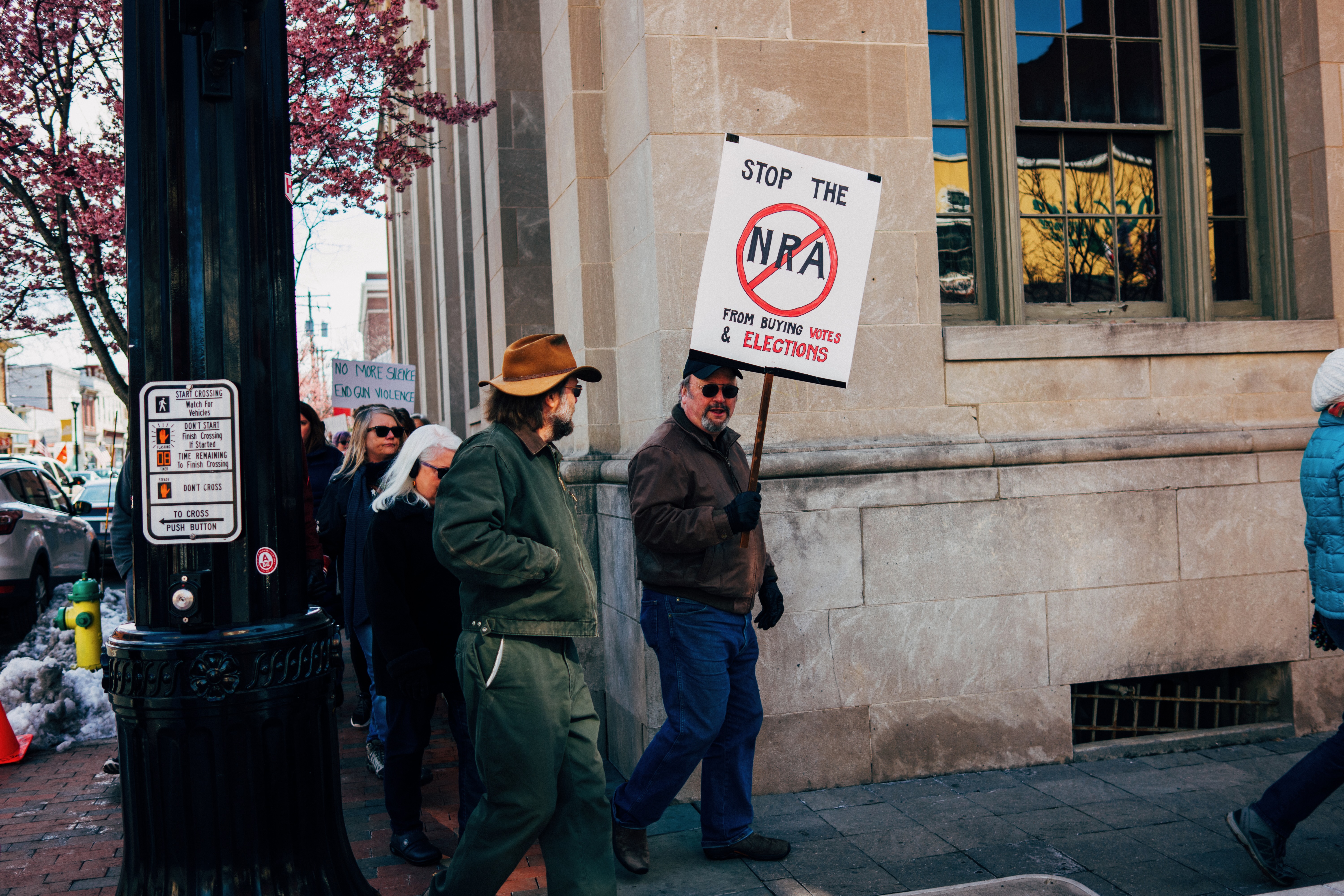 A group of determined protesters marches down a city street, advocating against the NRA. The mood is charged yet focused, with participants holding signs that capture their fervor. Soft, natural light bathes the scene, highlighting the diverse expressions of the crowd as they unite for a common cause.