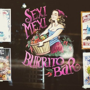 The photograph showcases a colorful sign for the 'Sexi Mexi Burrito Bar,' featuring a smiling woman holding a basket of vibrant vegetables. The lively colors and playful typography create an inviting and upbeat mood, drawing attention against the darker background. The composition is balanced, with the subject at the forefront, engaging the viewer's eye with its whimsical charm.