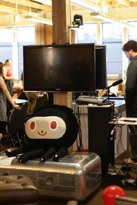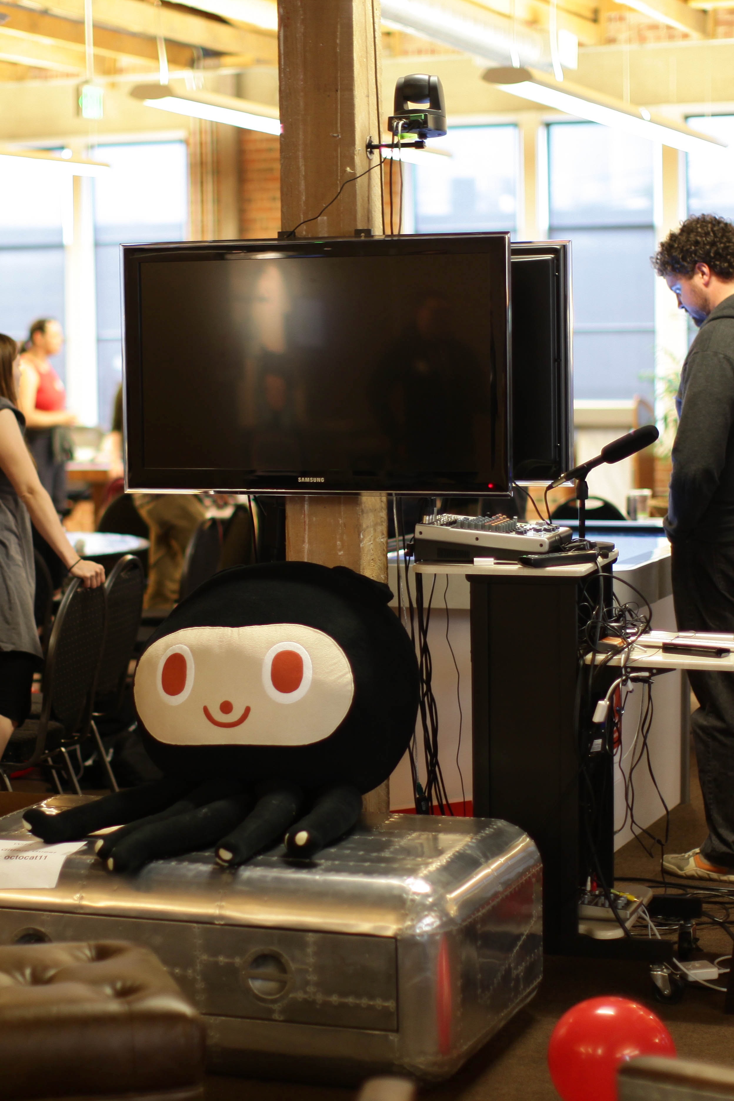 In a vibrant office setting, a large plush octopus with a cheerful expression sits prominently on a metallic crate, exuding a sense of whimsy and comfort. The warm, natural light streaming through the windows highlights the relaxed atmosphere, while people engage in conversation in the background, adding to the dynamic energy of the space.