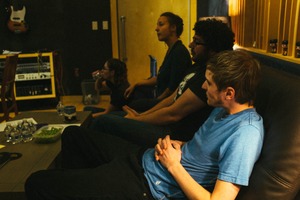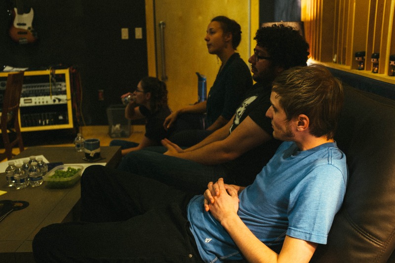 In a dimly lit recording studio, a group of individuals sit attentively, embodying a blend of concentration and anticipation. The soft lighting casts a warm glow, enhancing the sense of intimacy as they immerse themselves in the creative process. The composition captures a moment of collaboration, highlighting the connection between the artists and their craft.