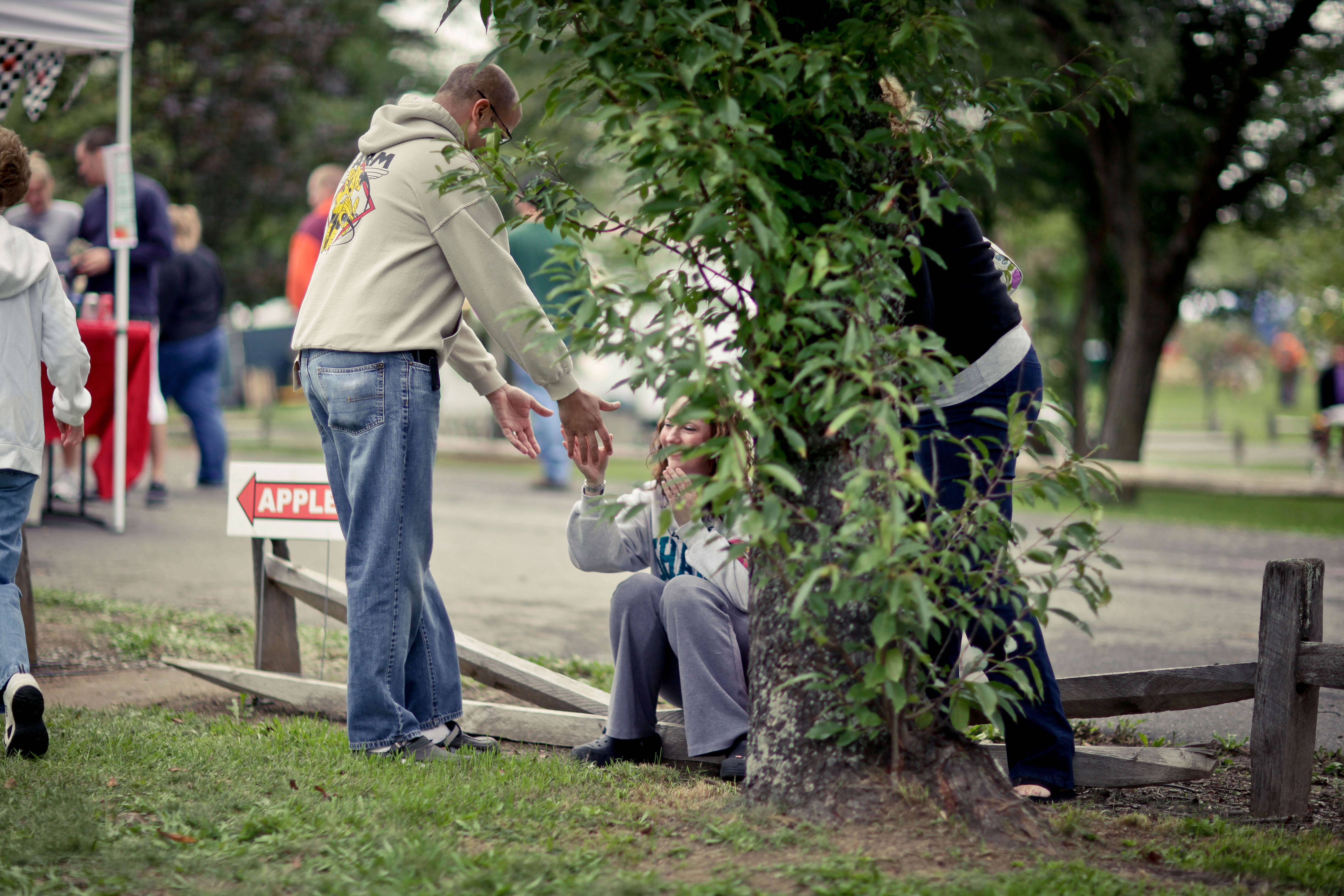 In a vibrant outdoor setting, two individuals reach across a tree trunk, their hands almost touching, suggesting a moment of connection and intimacy. The soft natural light filters through the leaves, enhancing the scene's calm and inviting mood. The blurred background of people engaged in various activities adds a sense of community and life to the composition.