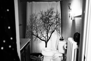 The photograph captures an intimate bathroom scene, dominated by a striking black-and-white shower curtain featuring an imposing tree design. The dim, soft lighting casts gentle shadows, enhancing the serene yet slightly melancholic mood of the space. The composition invites a moment of reflection, creating a sense of tranquility amidst the everyday setting.