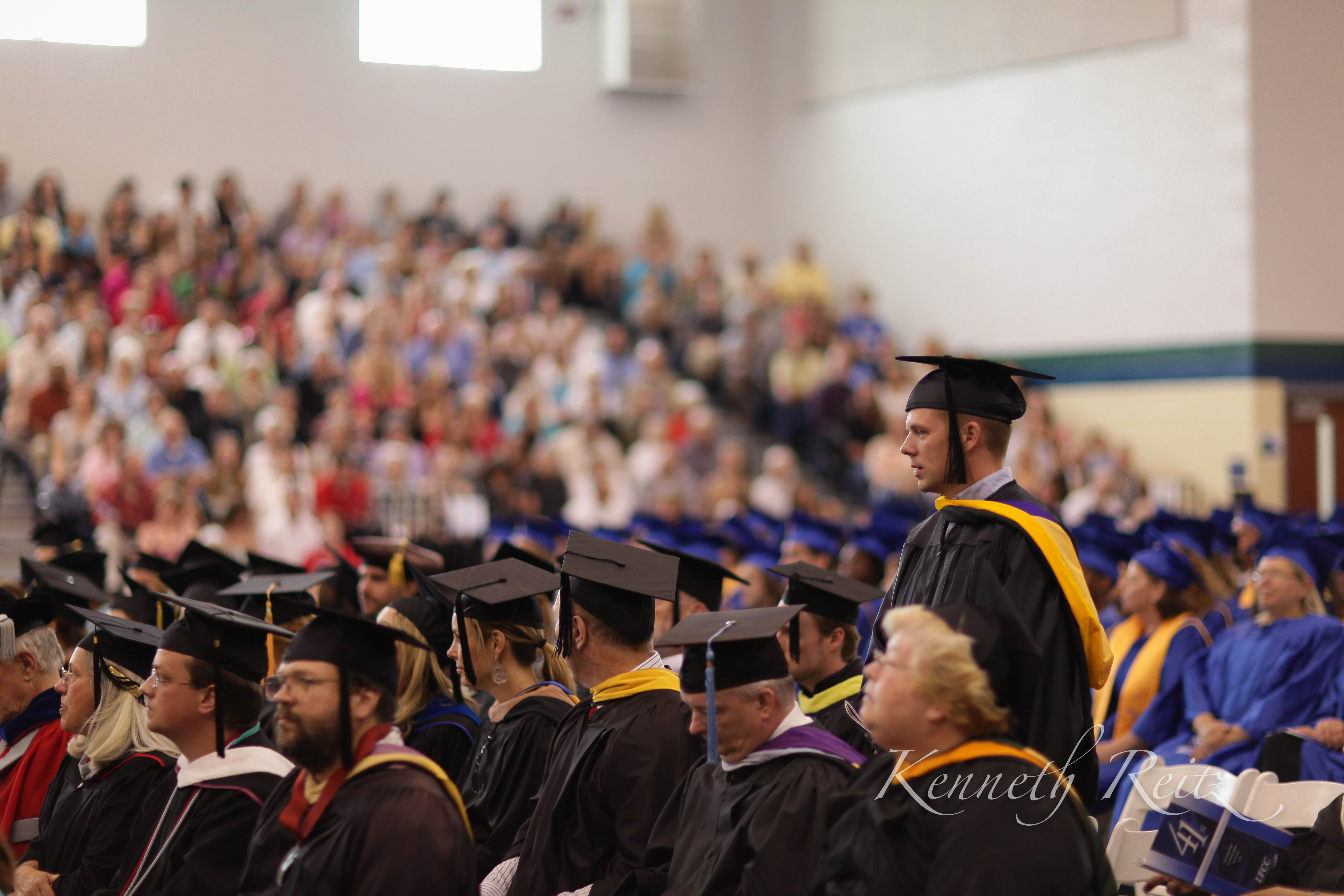 A sea of graduates in caps and gowns fills the auditorium, with an individual standing out in a striking ensemble of black and gold. The atmosphere is charged with a mix of anticipation and pride, highlighted by soft natural light filtering in from the high windows. The blurred crowd in the background underscores the moment, focusing attention on the graduate's significant achievement amidst the celebration.