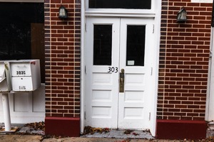 This photograph captures an unassuming set of double doors, marked with the number '303,' against a backdrop of textured brick. The muted lighting and fallen leaves evoke a sense of nostalgia, hinting at stories left untold. The juxtaposition of the bright white door and the earthy tones of the surroundings creates a striking yet solemn mood, inviting curiosity about what lies beyond.