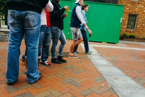 A group of casually dressed individuals walks briskly along a patterned brick path, their legs creating a dynamic sense of motion. The cool, muted lighting casts a relaxed atmosphere, with a green structure in the background contrasting against the warm tones of the ground. The scene captures a moment of urban life, highlighting the intermingling of movement and casual camaraderie.