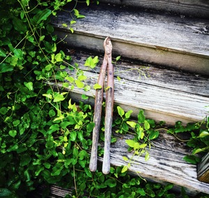 An old pair of garden shears lies forgotten on weathered wooden steps, surrounded by lush green vines. The contrasting textures of the metal and wood against the vibrant greenery evoke a sense of nostalgia and connection to nature. Soft, natural light filters through, casting gentle shadows that enhance the organic feel of the scene.