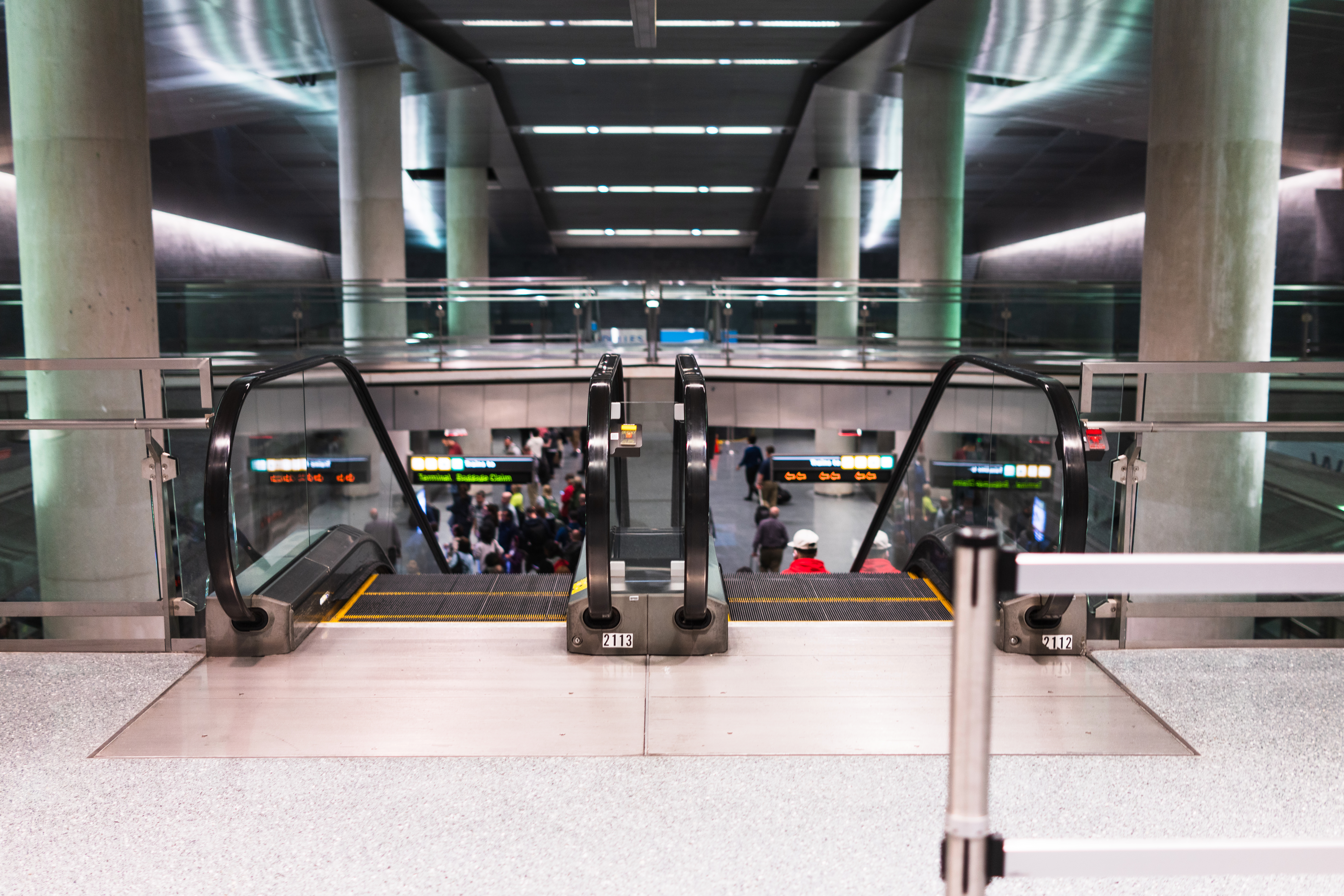 This photograph captures a sleek and modern underground station, framed by minimalist design and metallic tones. The escalators lead to a bustling crowd, suggesting movement and a sense of transition, while the cool, artificial lighting adds a futuristic mood. Strong architectural lines draw the eye downward, inviting viewers into the vibrant activity below.