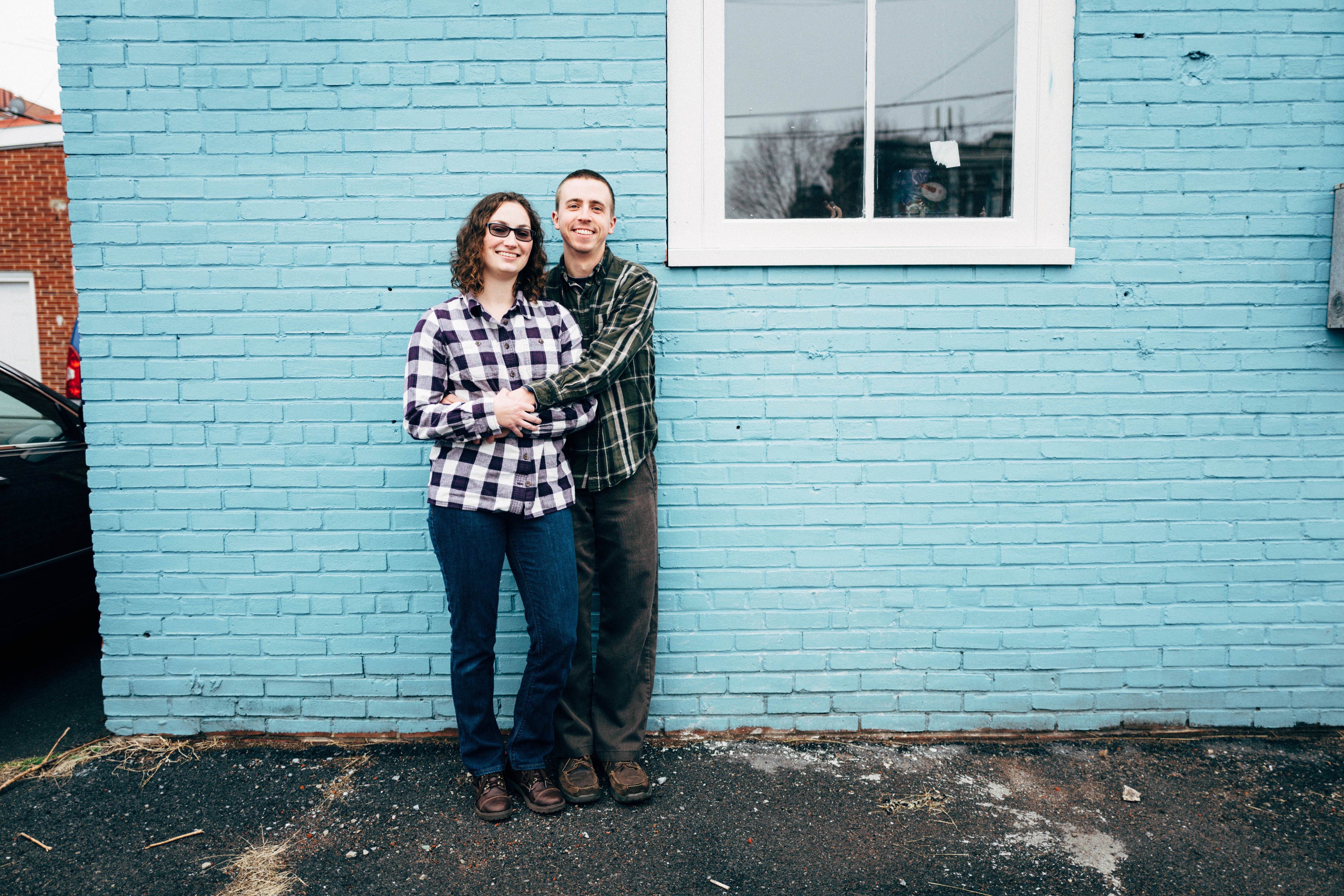 Against a vibrant blue brick wall, a couple stands close together, exuding warmth and casual intimacy. Their coordinating plaid outfits complement the lively backdrop, while soft, diffused light enhances the relaxed mood of the photograph. The composition captures not just their affection but also the simplicity of everyday moments shared in urban settings.