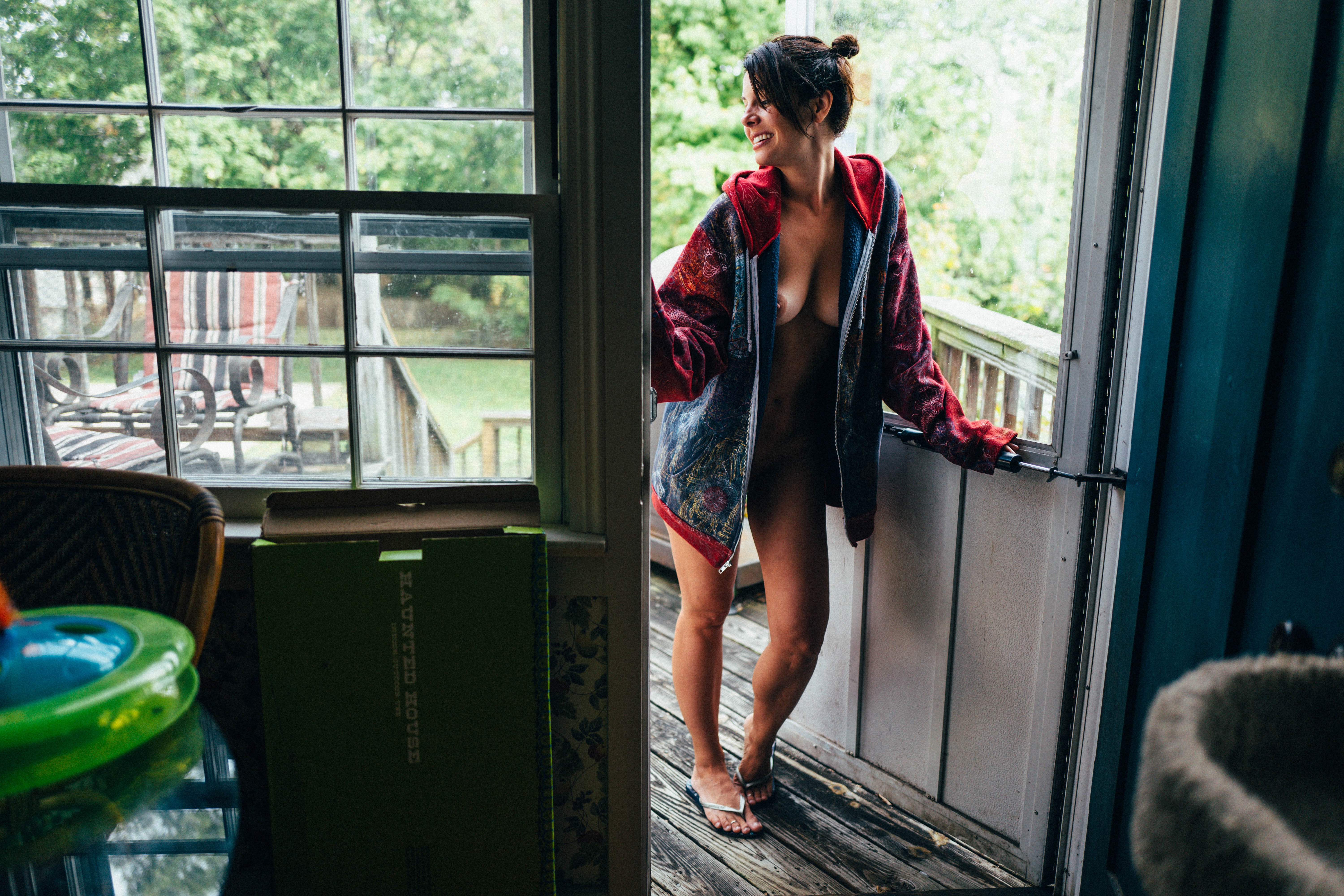 A cheerful figure stands at an open door, half-draped in a vibrant, oversized jacket. Soft, diffused light filters through the windows, casting a warm glow over the scene, accentuating the carefree atmosphere of a relaxed morning. The juxtaposition of the indoor elements and the lush greenery outside creates a sense of openness and tranquility.