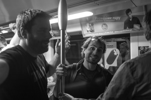 In a bustling subway car, two men stand close together, their expressions reflecting surprise and amusement amidst the crowd. The monochrome tones enhance the intimacy of the scene, while the overhead lights cast a soft glow, illuminating their features and creating a dynamic contrast against the darker surroundings. The composition captures the essence of urban life, where fleeting moments of connection emerge even in the most ordinary of settings.