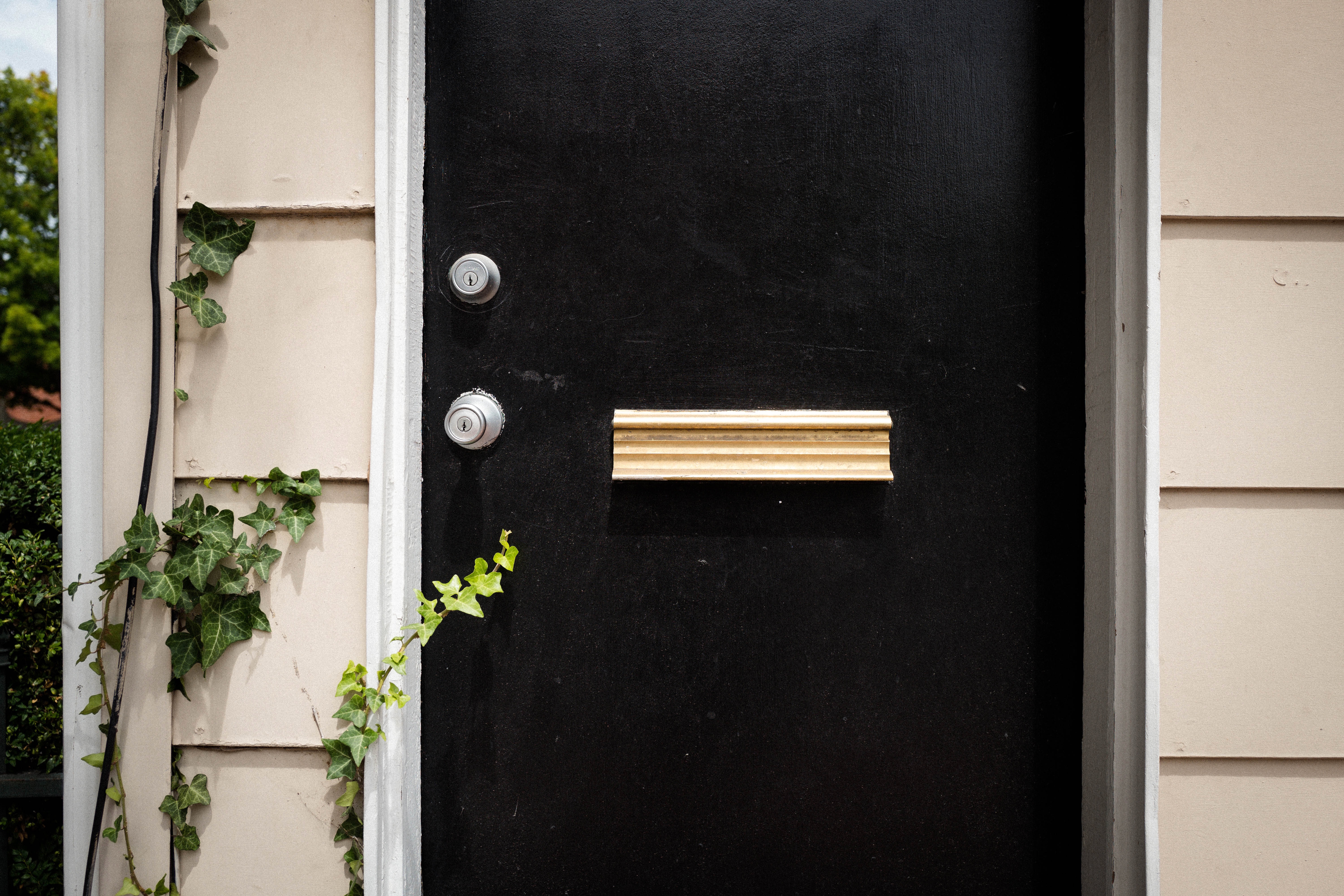 This photograph captures a black door adorned with a striking gold mail slot, contrasted against the light-colored siding and creeping ivy. The warm sunlight casts gentle shadows, creating a welcoming yet intriguing atmosphere that invites curiosity. The composition balances natural elements with architectural simplicity, evoking a sense of home and possibility.