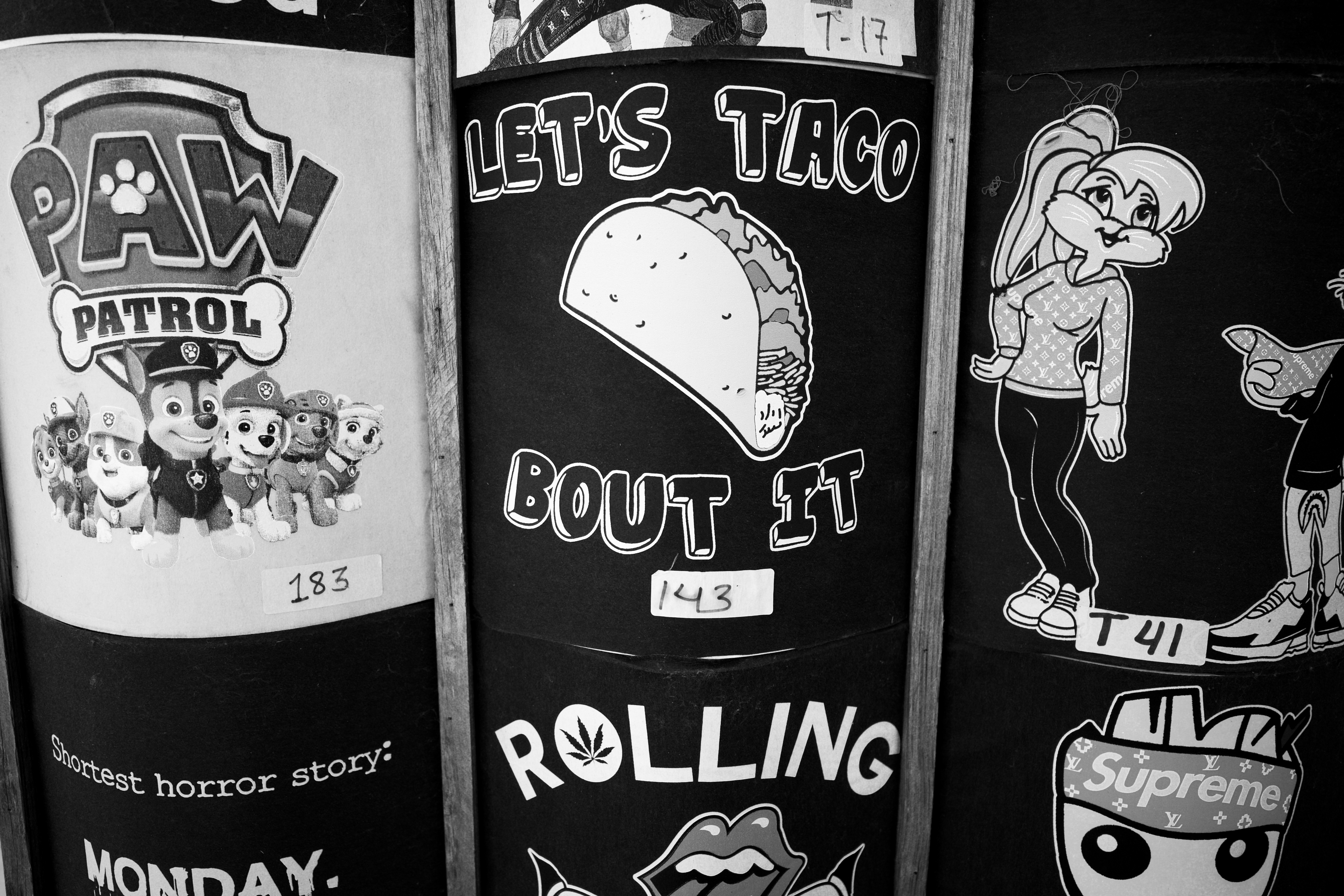 This photograph captures a vibrant collage of graphics showcasing playful illustrations and witty phrases, blending pop culture with food-themed humor. The black and white composition highlights the contrasting elements, lending a nostalgic yet contemporary feel to the scene. The varied textures and designs create a dynamic visual rhythm, inviting the viewer to engage with each quirky detail.