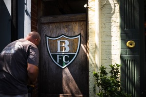 A man is seen leaning toward a wooden door adorned with a prominent logo, suggesting a blend of candidness and purpose. The warm sunlight bathes the scene, casting gentle shadows that enhance the rich textures of the door and surrounding architecture. Lush greenery peeks into the frame, adding a hint of life and contrast to the rustic facade.