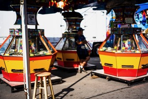 Amid the vibrant colors of carnival game booths, a solitary figure leans against the edge, immersed in a moment of quiet contemplation. The dynamic hues of yellow and red juxtapose with the bright sunlight, casting playful shadows that enhance the lively yet relaxed atmosphere. The blurred foreground adds a sense of depth, drawing attention to both the bold game stands and the solitary presence, creating a striking contrast between the bustle of carnival life and personal introspection.