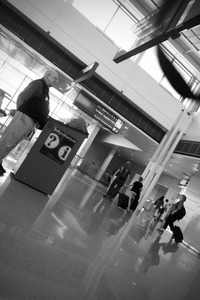 In this black-and-white photograph, a lone airport information attendant stands at his post, exuding a sense of calm amidst the hustle and bustle of travelers. The composition emphasizes the reflective surfaces of the terminal floor, while natural light pours in from above, casting soft shadows and enhancing the serene yet transient atmosphere. There's a juxtaposition between the stillness of the attendant and the movement of passengers, embodying the essence of travel and waiting.