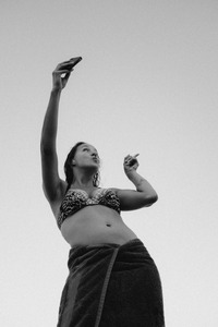 A young woman stands confidently, her figure silhouetted against the light sky as she takes a selfie. The composition emphasizes her upward reach, conveying a sense of aspiration and spontaneity, while the monochrome tones add a timeless quality to the moment. Her expression, a mix of focus and playfulness, enhances the candid mood of the photograph.