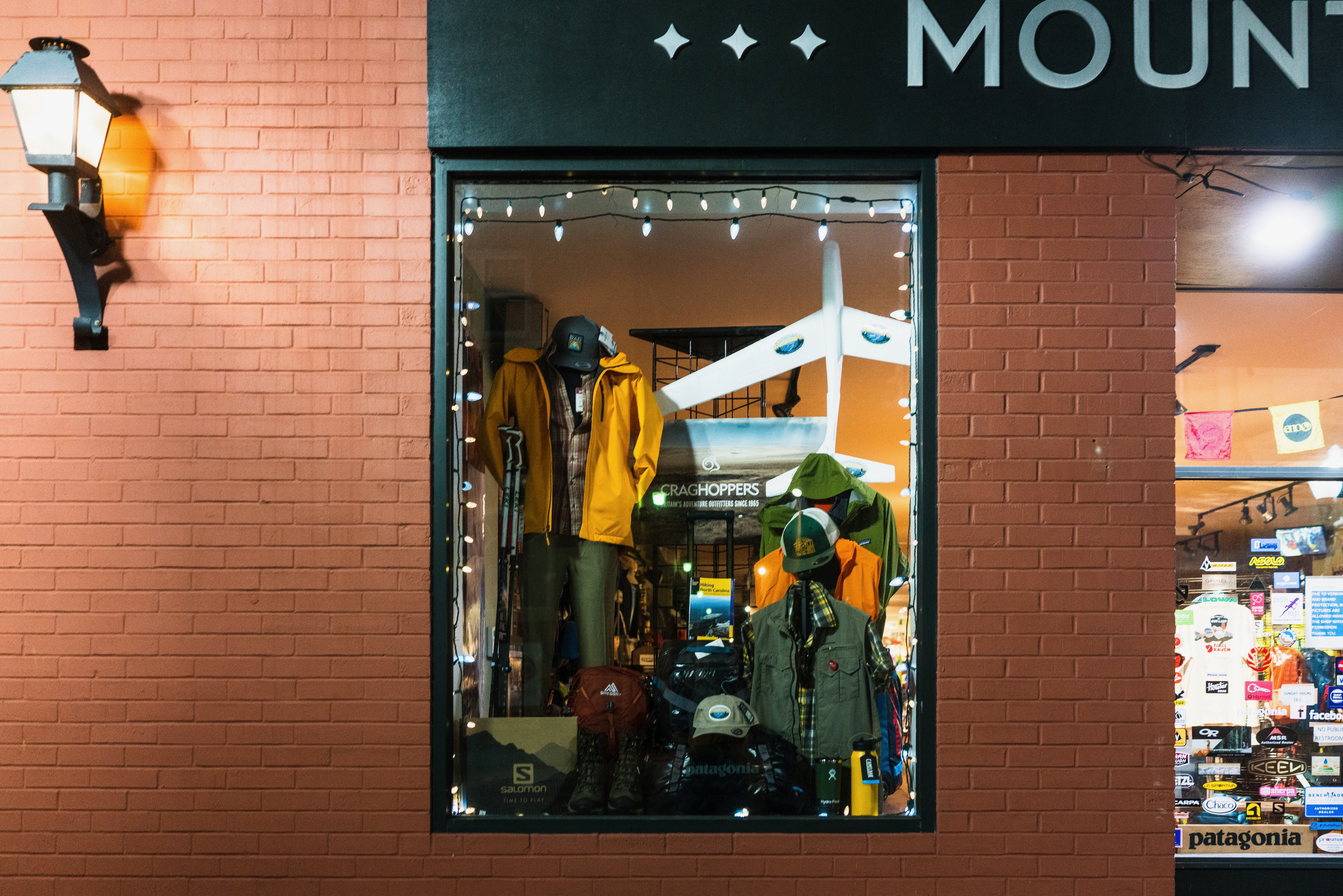 The photograph captures a vibrant retail window showcasing an array of outdoor apparel and gear, illuminated by soft lights that create a warm, inviting atmosphere. Jackets in bright colors hang prominently, while gear like a backpack and a ball add interest to the foreground, inviting passersby to explore. The mood is adventurous and energetic, evoking a sense of wanderlust amidst a cozy urban setting.