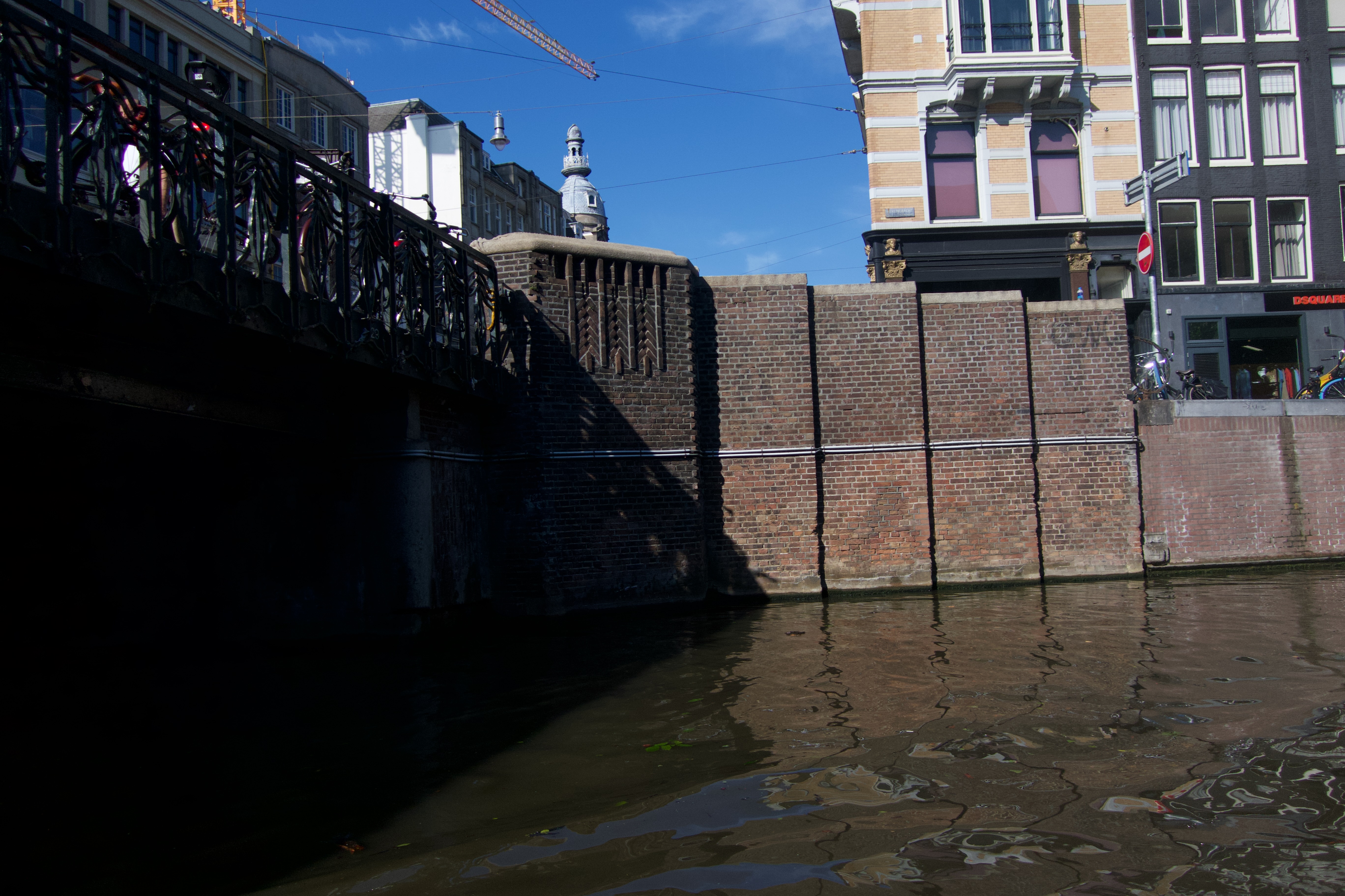 This photograph captures a serene moment along a canal, framed by a mix of historical and modern architecture. The sunlight dances on the water's surface, enhancing the vibrant colors and creating a tranquil atmosphere. The shadow of the bridge juxtaposes with the clear blue sky, evoking a sense of peaceful urban life.