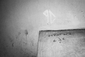This photograph features a close-up of a worn wooden surface, marked with cryptic inscriptions and graffiti against a textured wall. The monochromatic tones evoke a mood of desolation and curiosity, inviting the viewer to ponder the stories behind the markings. Soft lighting emphasizes the imperfections of the surface, enhancing the overall sense of urban decay.