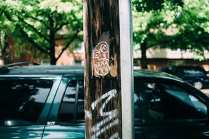 This photograph captures a weathered wooden utility pole adorned with a quirky, peeling sticker of a face. The background features a lush green canopy, contrasting with the textured wood and muted colors of parked cars, creating a playful yet urban atmosphere. Soft, natural light filters through the trees, enhancing the sense of spontaneity and whimsical charm.