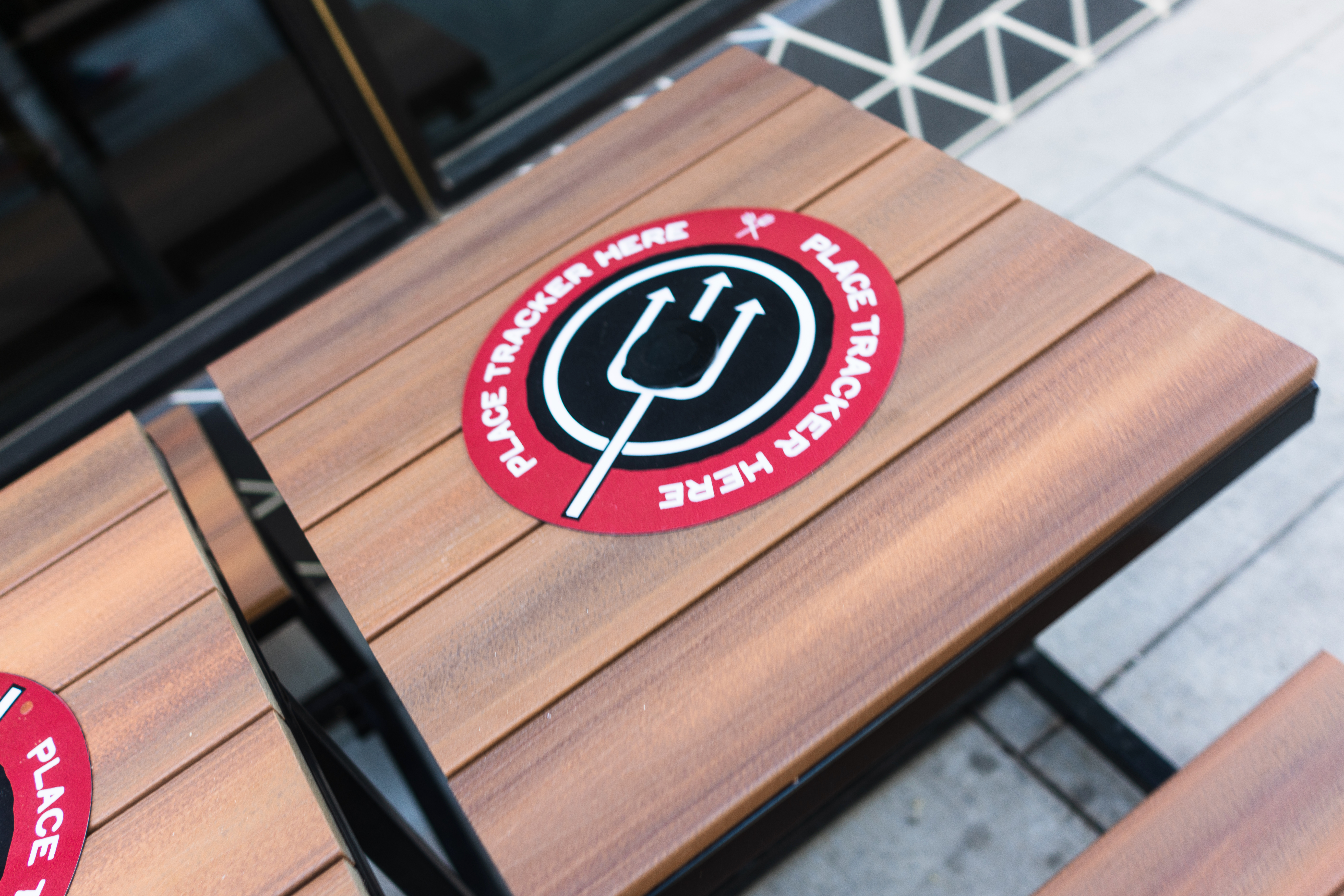 The photograph captures a close-up view of wooden tabletops featuring circular red markers with contrasting black graphics, inviting engagement. The playful design and vibrant colors contrast with the neutral wood tones, creating a lively atmosphere. Soft natural light enhances the textures of the surface, suggesting a welcoming space for diners.