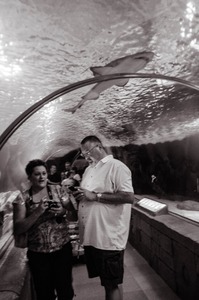 In a dimly lit aquarium tunnel, a couple stands captivated by the aquatic world around them, illuminated by soft, filtered light from above. Above them, a shark glides gracefully through the water, adding an element of wonder to the scene. The monochrome tones enhance the intimacy of the moment, contrasting the couple's engagement with their surroundings against the mysterious depths of the ocean.