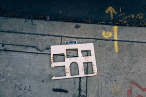 This photograph captures a discarded piece of material resembling a building facade, lying on a concrete surface. The muted tones and stark lighting create a somber mood, hinting at stories lost within urban detritus. Vivid yellow markings from the road contrast the dullness of the pavement, adding a layer of intrigue to this scene of neglect and forgotten remnants.