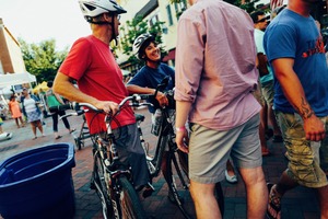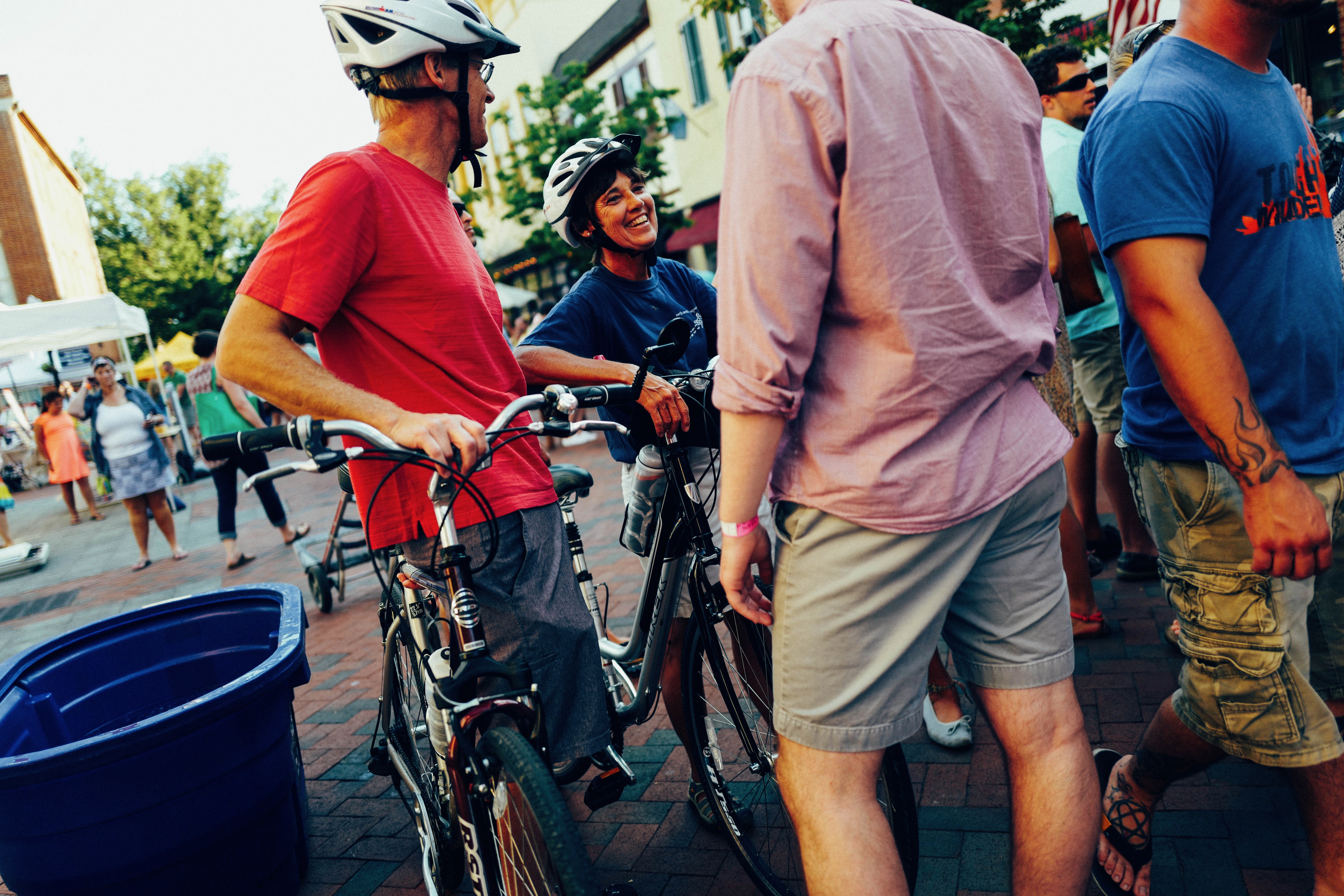 In a vibrant street scene, a small group of cyclists engage in lighthearted conversation, their smiles radiating warmth and camaraderie. The summer sunlight bathes the scene in a golden hue, enhancing the relaxed atmosphere as onlookers meander nearby. The composition captures a lively sense of community and the joy found in shared experiences.
