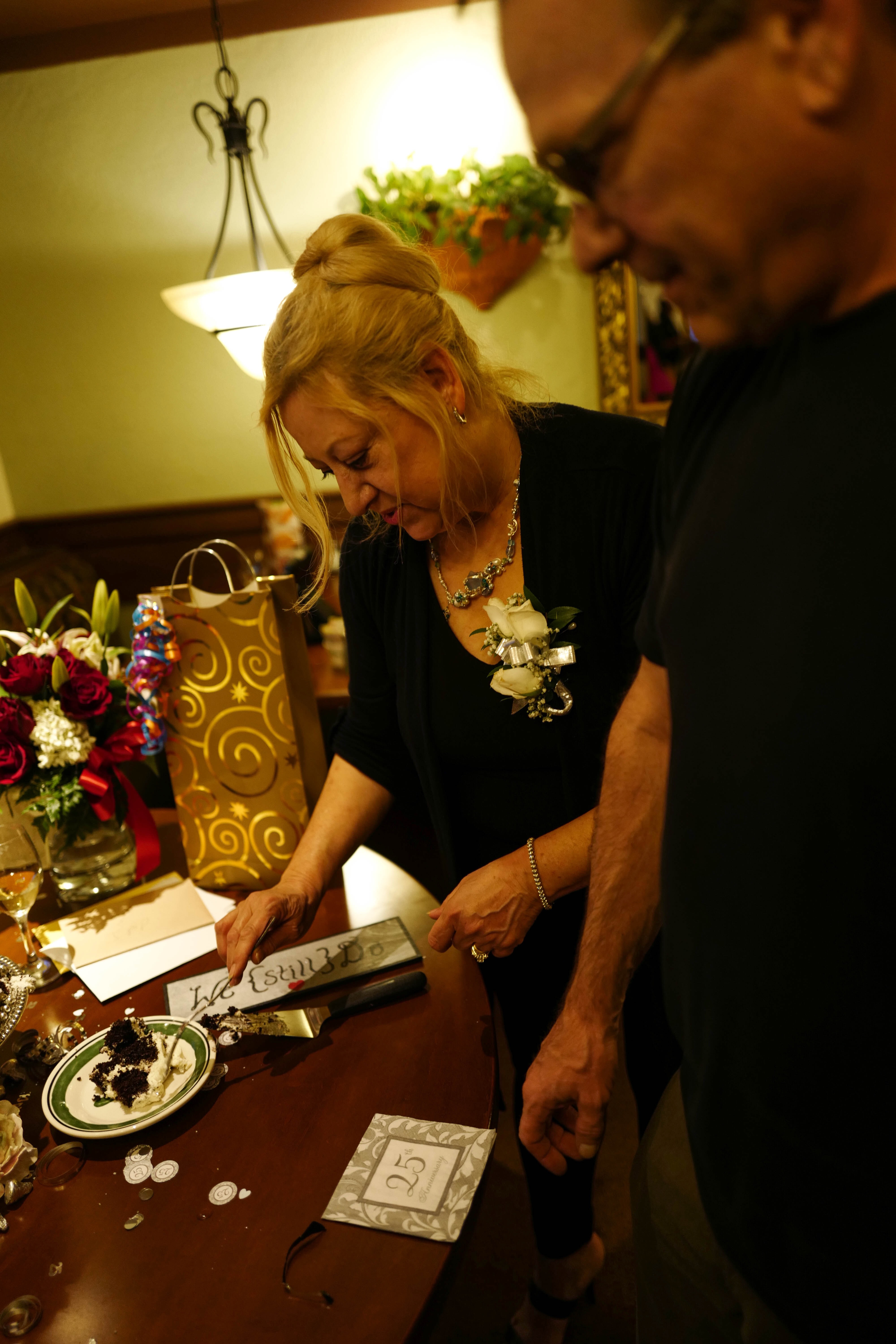 In a warm, intimate setting, a woman examines a heartfelt gift while a man looks on, both caught in a moment of genuine connection. The soft, ambient lighting casts a cozy glow over the scene, enhancing the festive mood as they celebrate a milestone together. The table is adorned with remnants of cake and colorful wrapping, hinting at a joyous occasion filled with shared memories.
