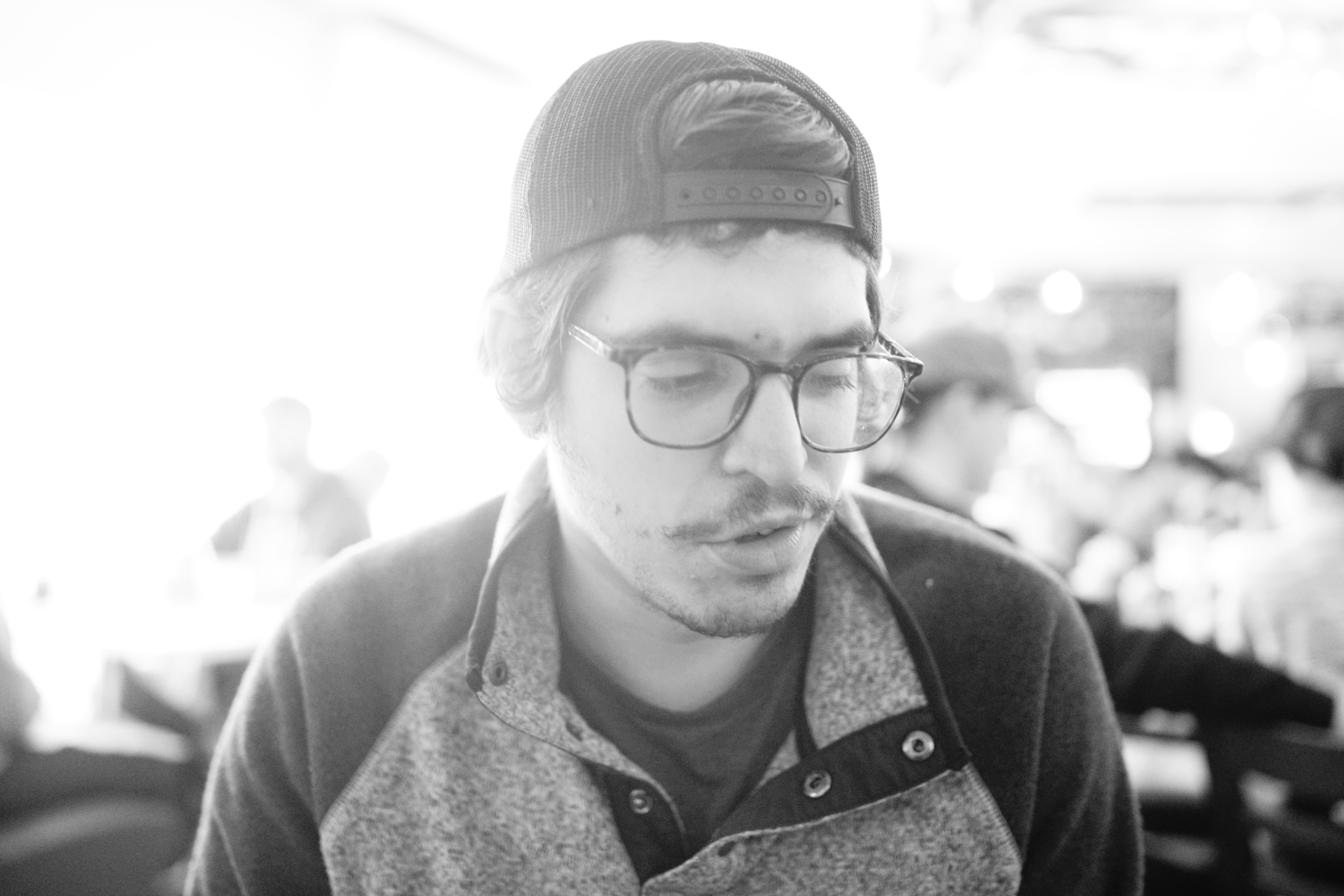 The photograph captures a young man in deep thought, his gaze directed downward as he sits amidst a softly illuminated café background. The high-contrast black-and-white aesthetic lends an air of introspection, while the soft lighting highlights his facial features and adds a dreamlike quality to the scene. The composition focuses on his contemplative expression, evoking a mood of quiet reflection within the bustling environment.