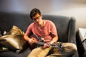 A young man sits comfortably on a gray couch, deeply engrossed in playing a mandolin. The warm, soft lighting creates a cozy atmosphere, enhancing the feeling of introspection and creativity. His relaxed posture and focused expression suggest a serene moment of personal expression, surrounded by plush textures and muted tones.