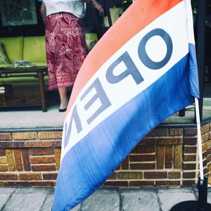 The photograph captures a vibrant 'OPEN' flag, its bold colors contrasting against the muted tones of a cozy shop interior. In the background, the hint of a figure in a flowing skirt adds a personal touch, creating an inviting atmosphere. The soft lighting enhances the serene mood, making the scene feel warm and welcoming.