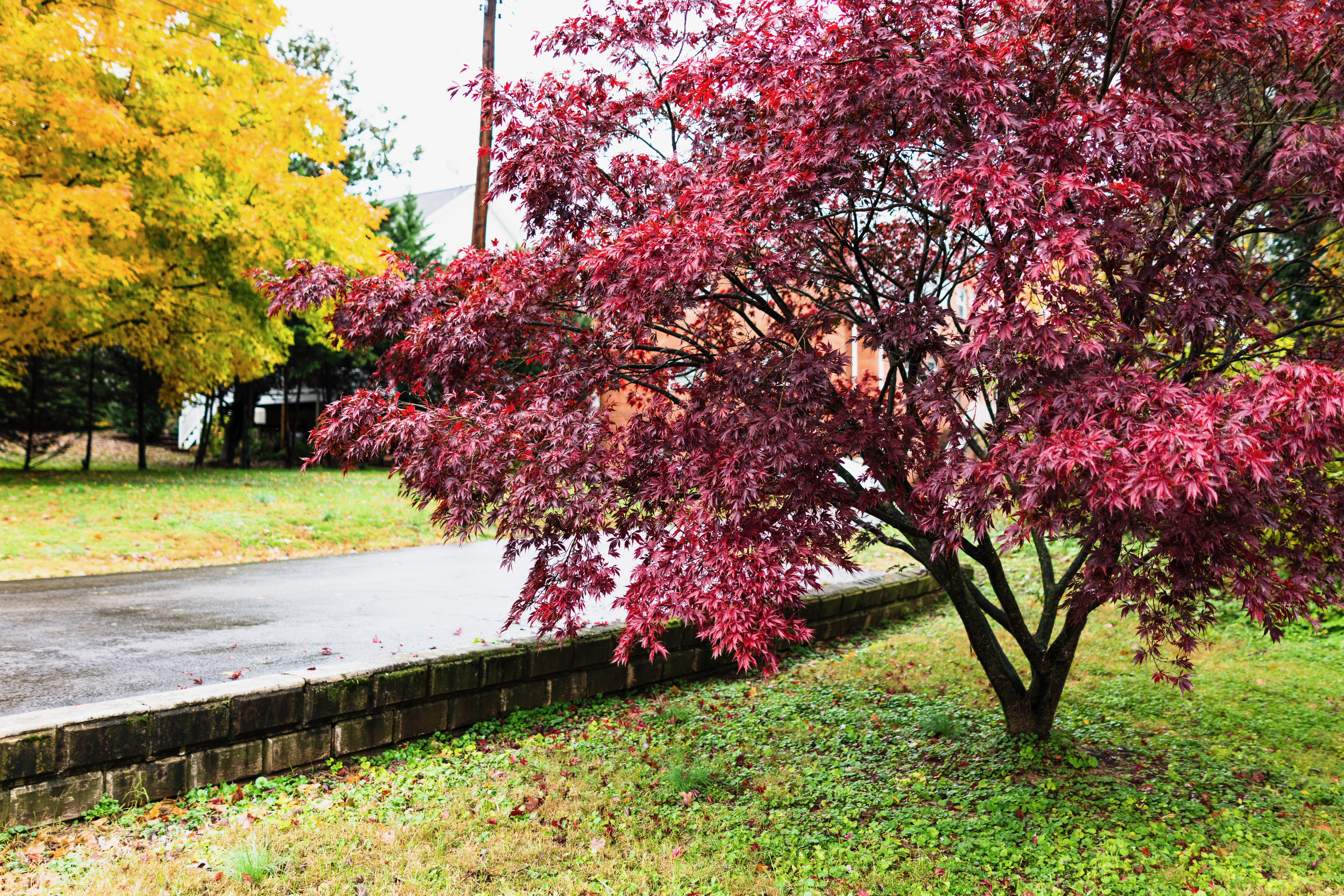 A striking red maple tree stands prominently beside a glistening wet road, its leaves glowing in rich crimson tones. Surrounding it, the patchy green lawn adds a fresh perspective, while fading yellow foliage hints at the transitions of autumn. The soft, diffused light captures the tranquil mood of a peaceful moment in nature, inviting contemplation and reflection.