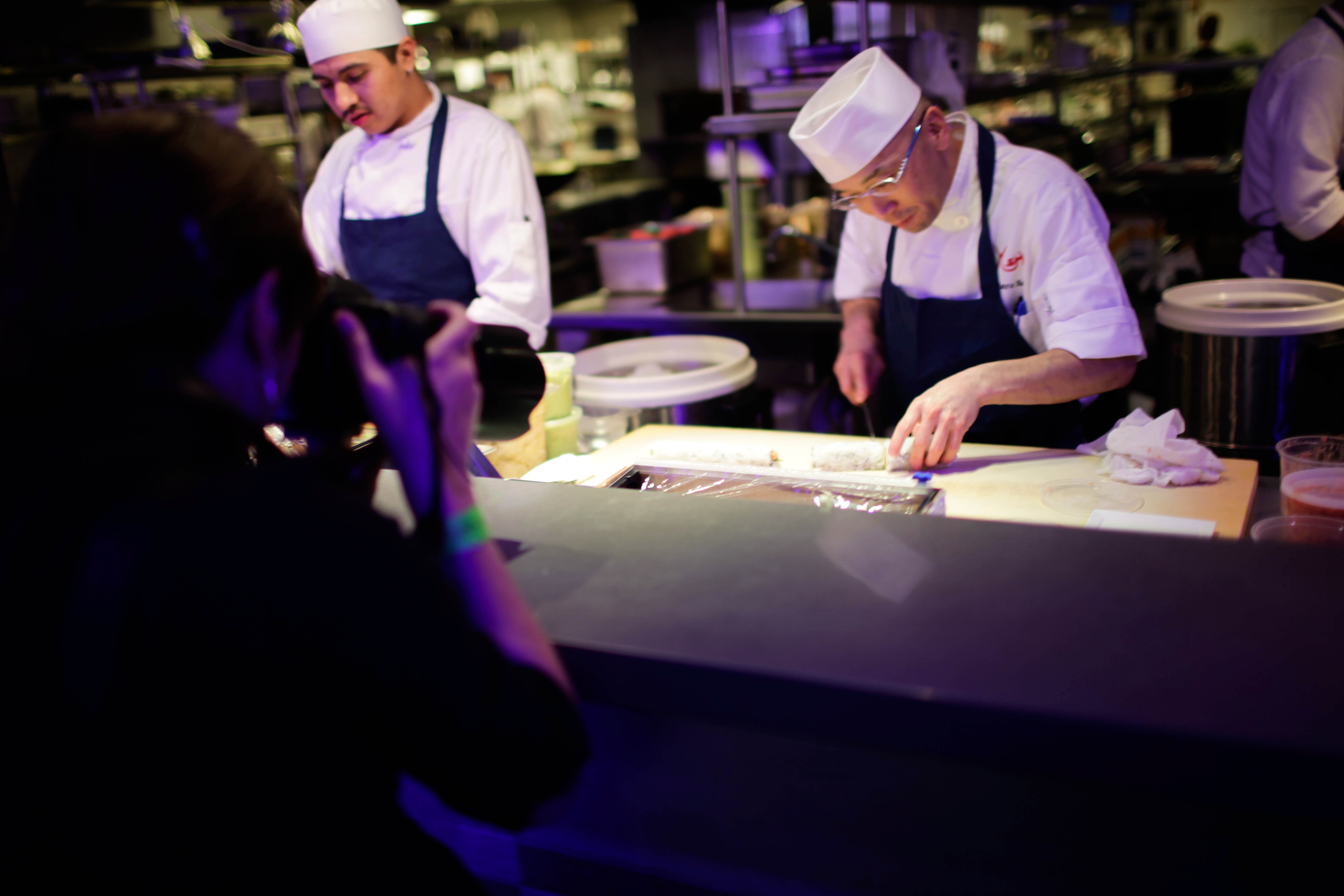 The photograph captures chefs at work in a bustling kitchen, surrounded by the soft glow of overhead lights. One chef is meticulously preparing a dish, while another appears engaged in conversation, creating a dynamic atmosphere filled with energy and focus. The angled perspective draws the viewer into the vibrant world of culinary artistry, emphasizing the dedication and skill involved in their craft.