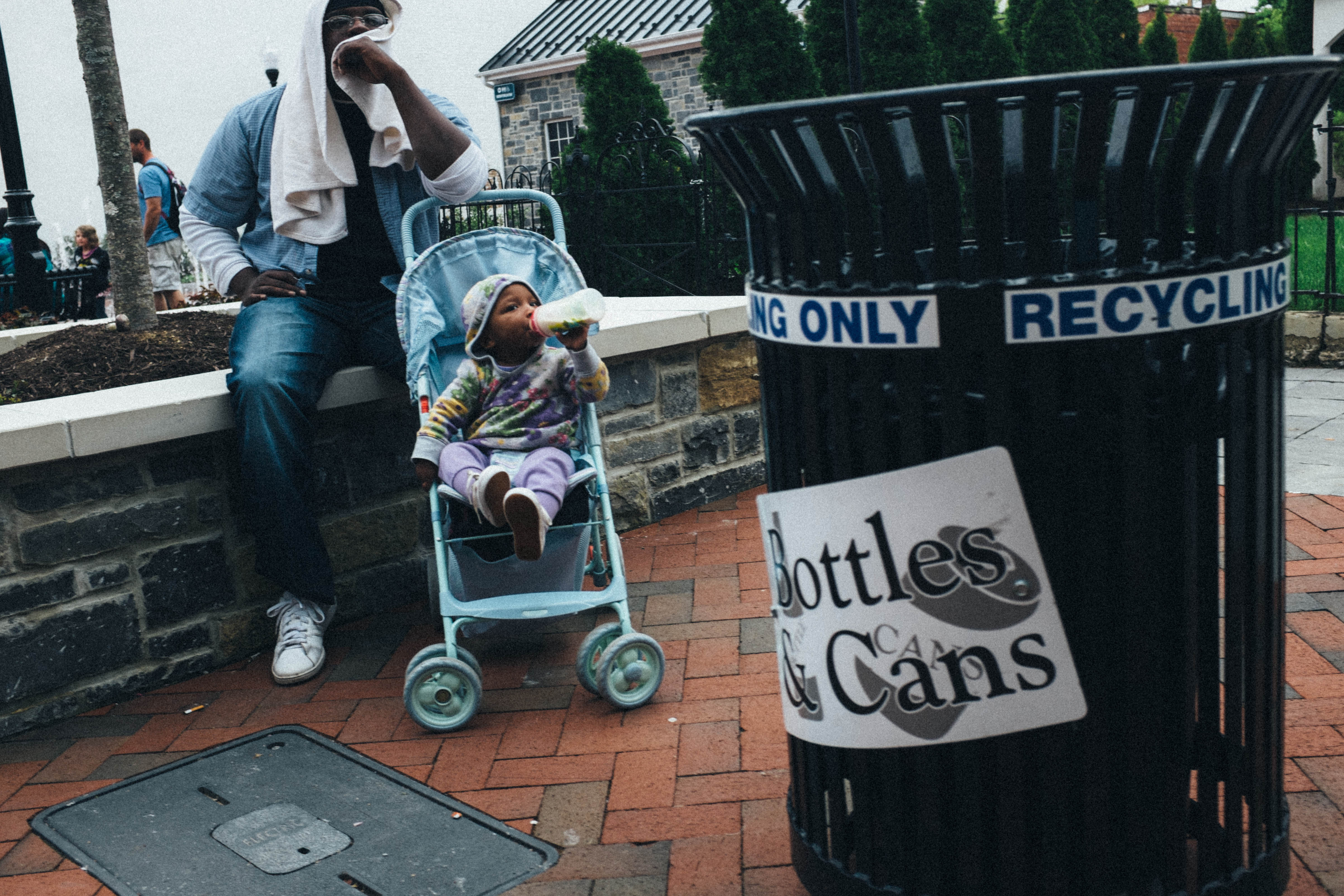 In this candid scene, a father takes a moment of respite, sitting beside a stroller with his child quietly nursing a bottle. The mood is relaxed yet attentive, as the soft afternoon light casts a gentle glow, highlighting the contrasting textures of the brick path and the metallic trash bin marked for recycling. The composition frames the pair against a backdrop of urban life, emphasizing the simplicity and warmth of their connection amid the hustle.